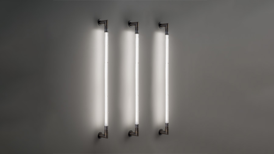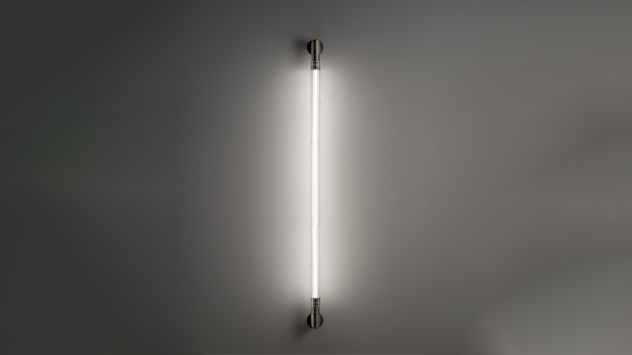 Linear wall sconce with vertical design, featuring a transparent ribbed glass tube that diffuses light softly. Dark Brass metal supports add elegance and architectural character.
