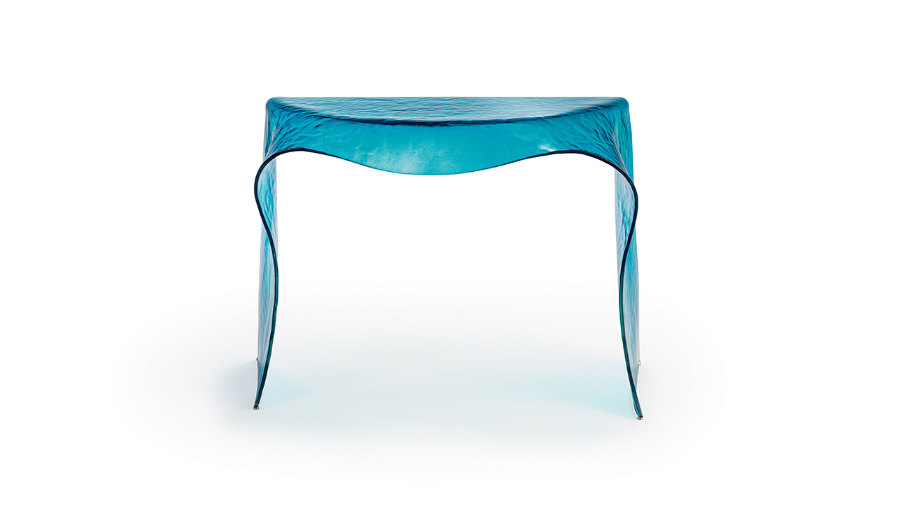 Console in curved Acqua glass, crafted entirely from glass, featuring a continuous surface and a strong material presence.