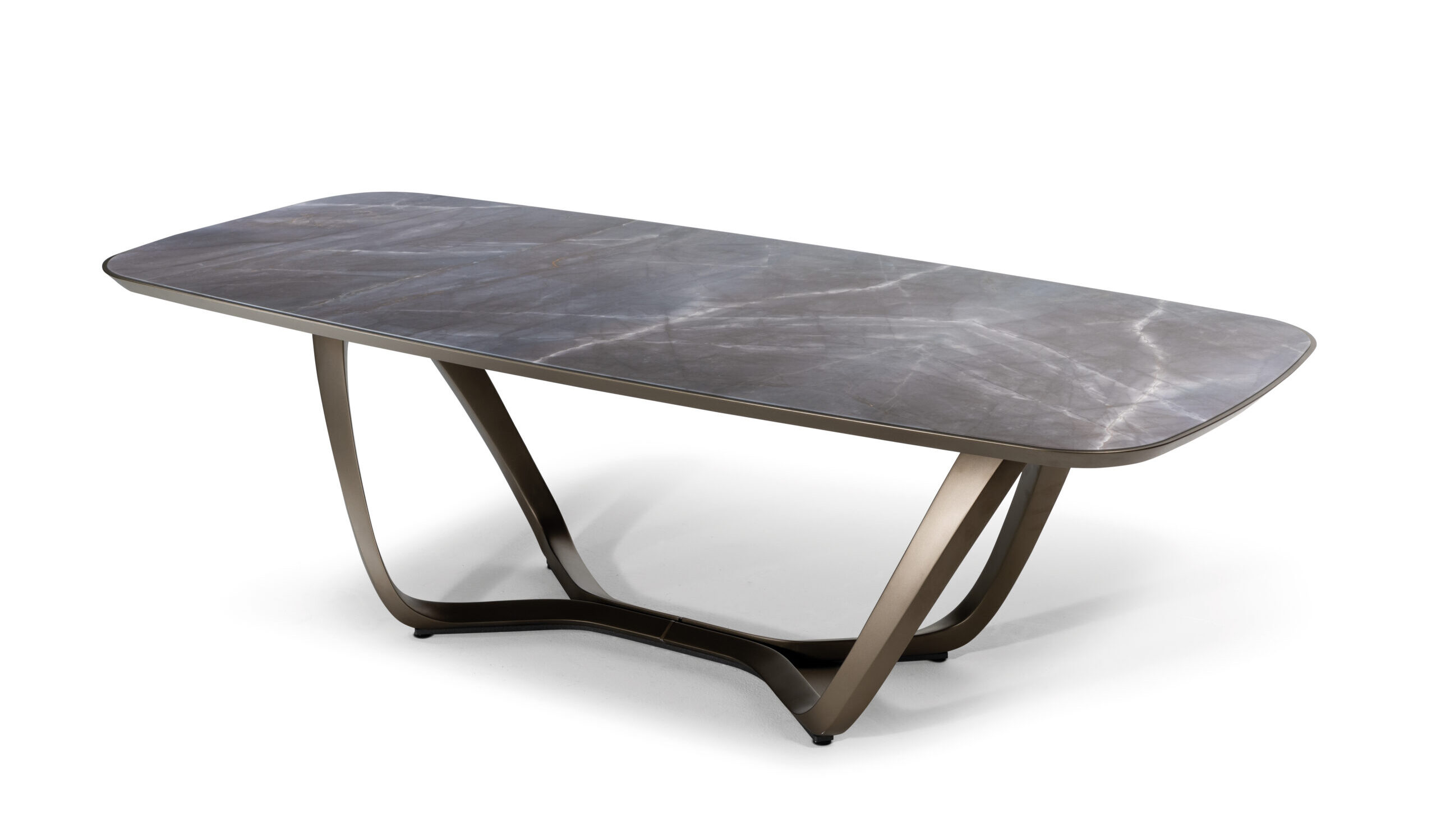 Dining table with metal-reinforced composite base and top available in various material configurations.
