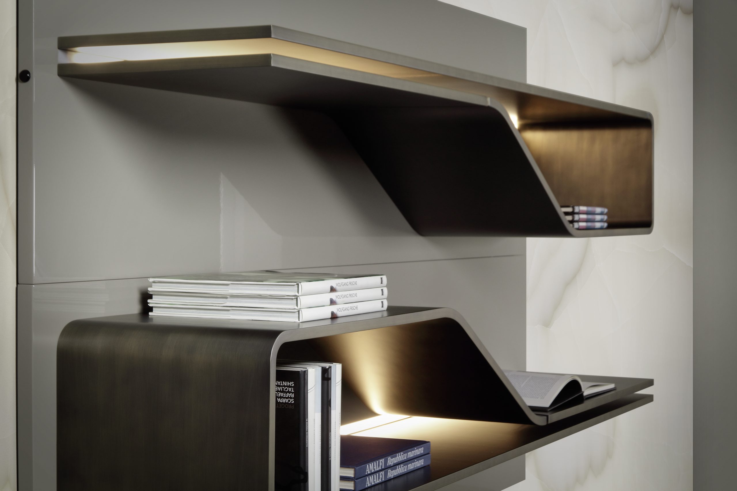 Interlocking element for modular bookshelf with wooden back and curved shelf. Integrated LED lighting with touch system.