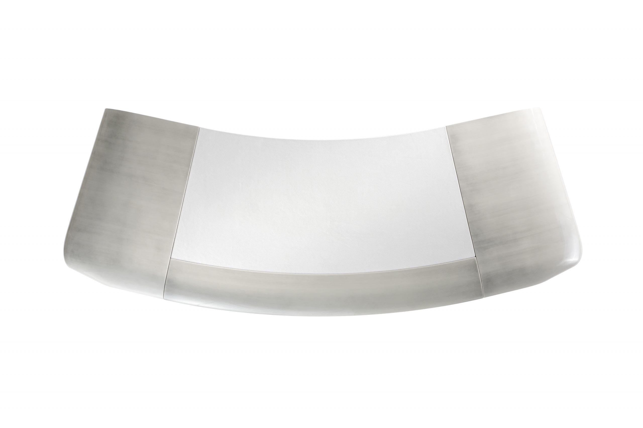 An executive desk with a fluid, continuous design, featuring a curved metal structure that creates a sculptural yet functional look. The Natural leather covering on the front, and optionally on the top, adds a tactile, bespoke dimension while maintaining a strict and professional style.