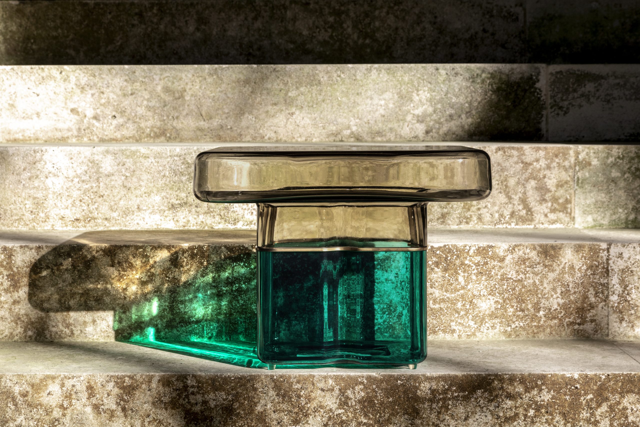 Tavolino centrale e terminale con basamento in vetro di Murano trasparente, blu-grigio, cioccolato o tabacco e supporto in ottone satinato. Piano in specchio bronzo oppure in vetro extrachiaro acidato per la versione con luce LED interna.