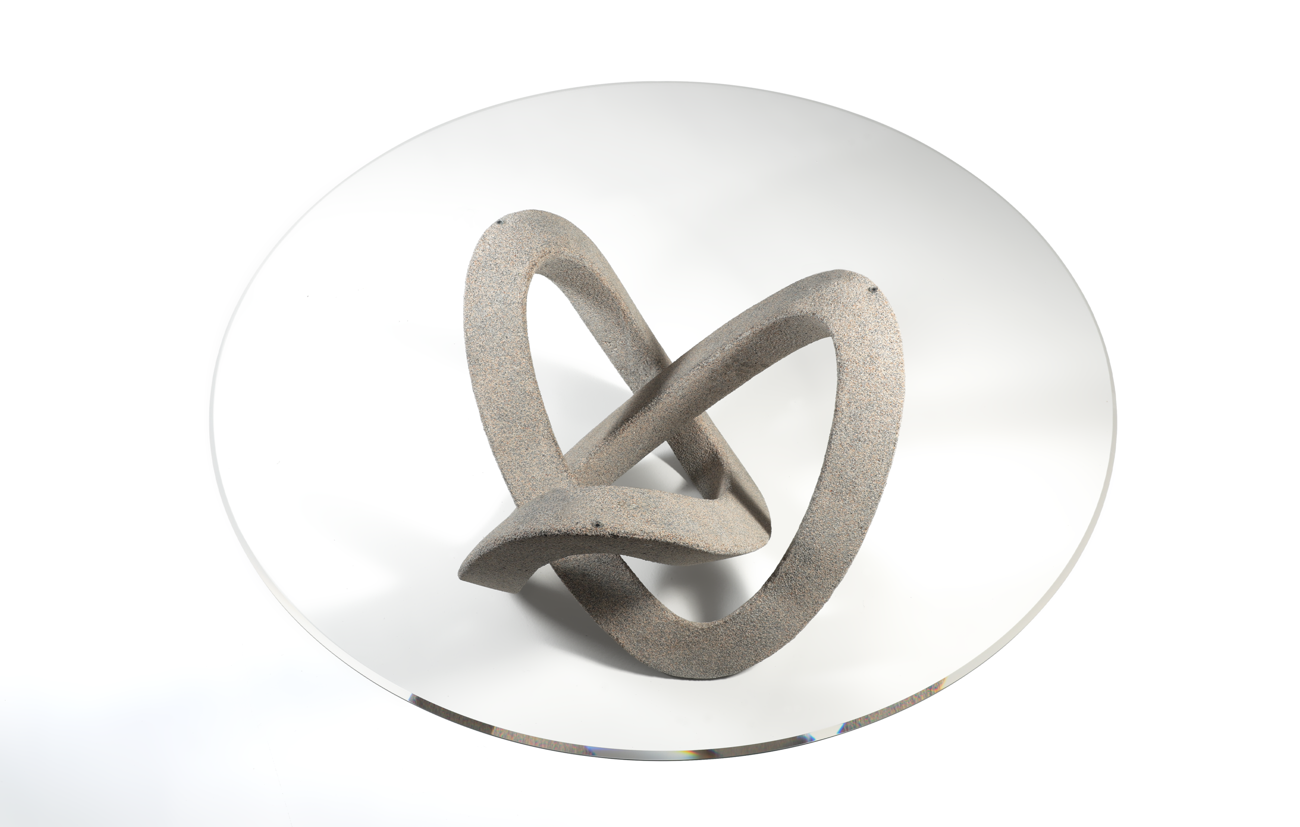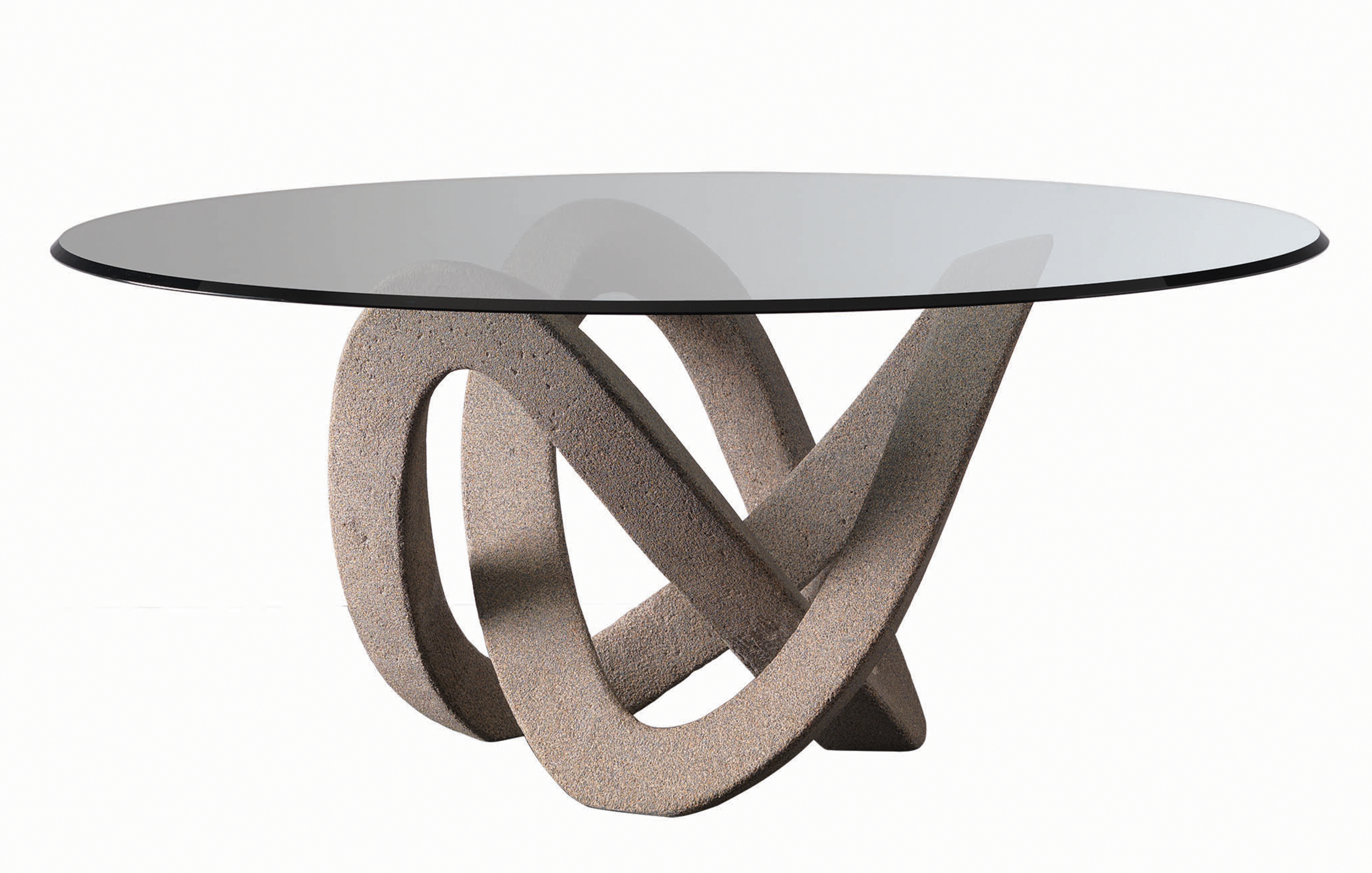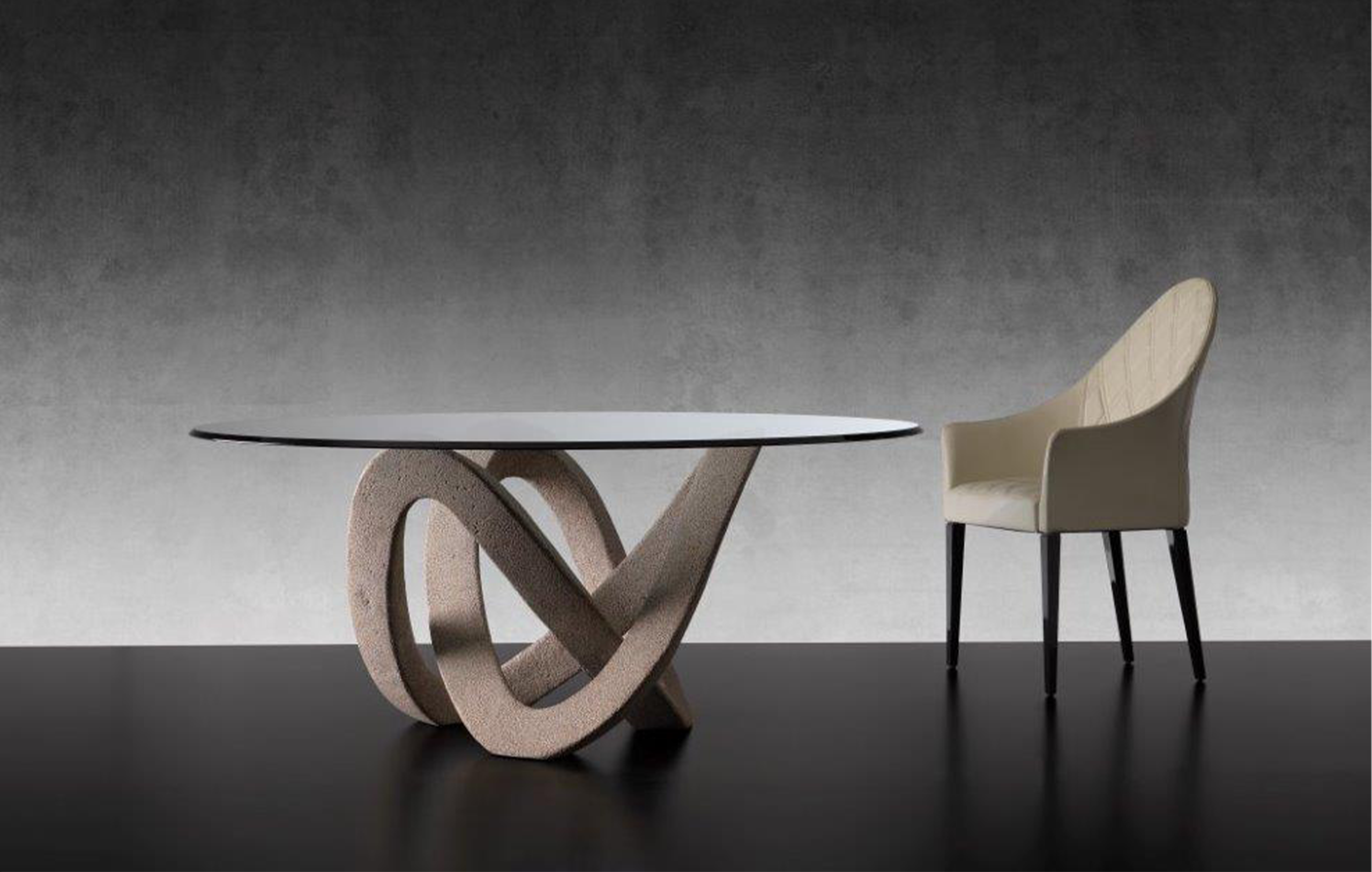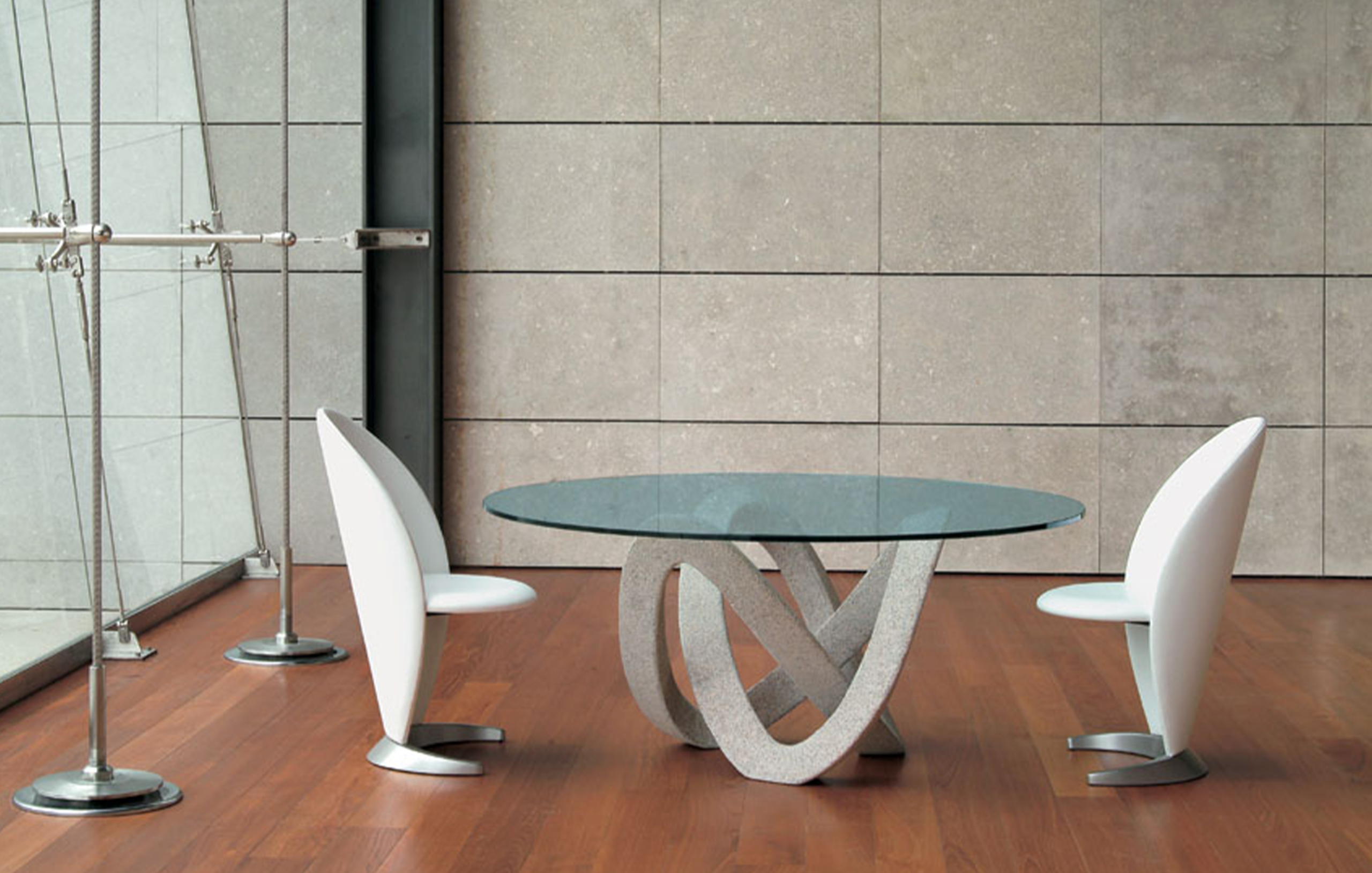 Tavolo da pranzo con basamento in materiale granitico scolpito e bocciardato e piano in vetro con bisello 45°.