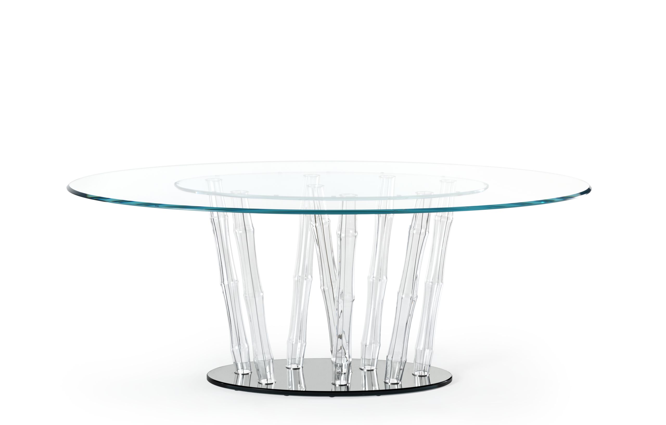 Tavolo da pranzo con base composta da bastoni in vetro di Murano con filigrana Tortora, zoccolo in specchio fumé e sotto-top in vetro extrachiaro.