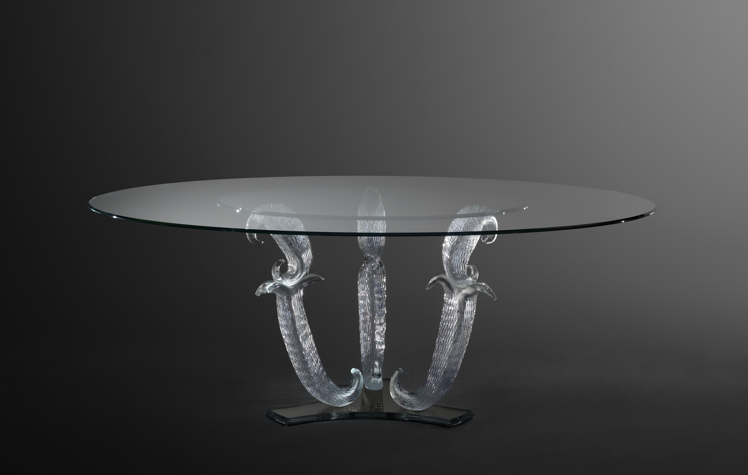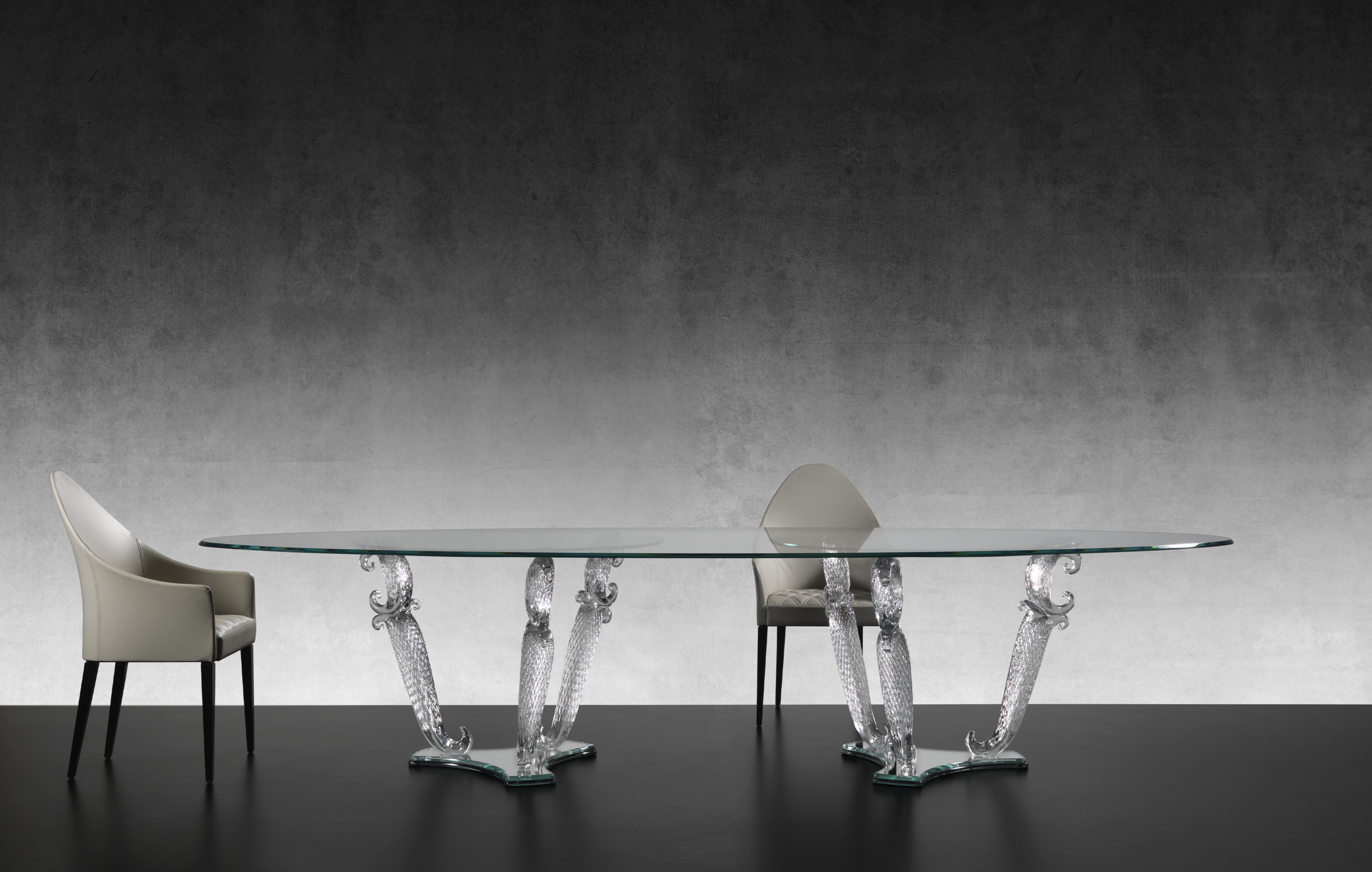 Tavolo da pranzo con base composta da gambe in vetro di Murano lavorate a mano, disponibile nelle finiture trasparente o oro zecchino. Zoccolo unico in vetro nero. Piano in vetro extrachiaro spessore 15mm con bisello 45° con fascia perimetrale con incisioni Bohème opzionale.