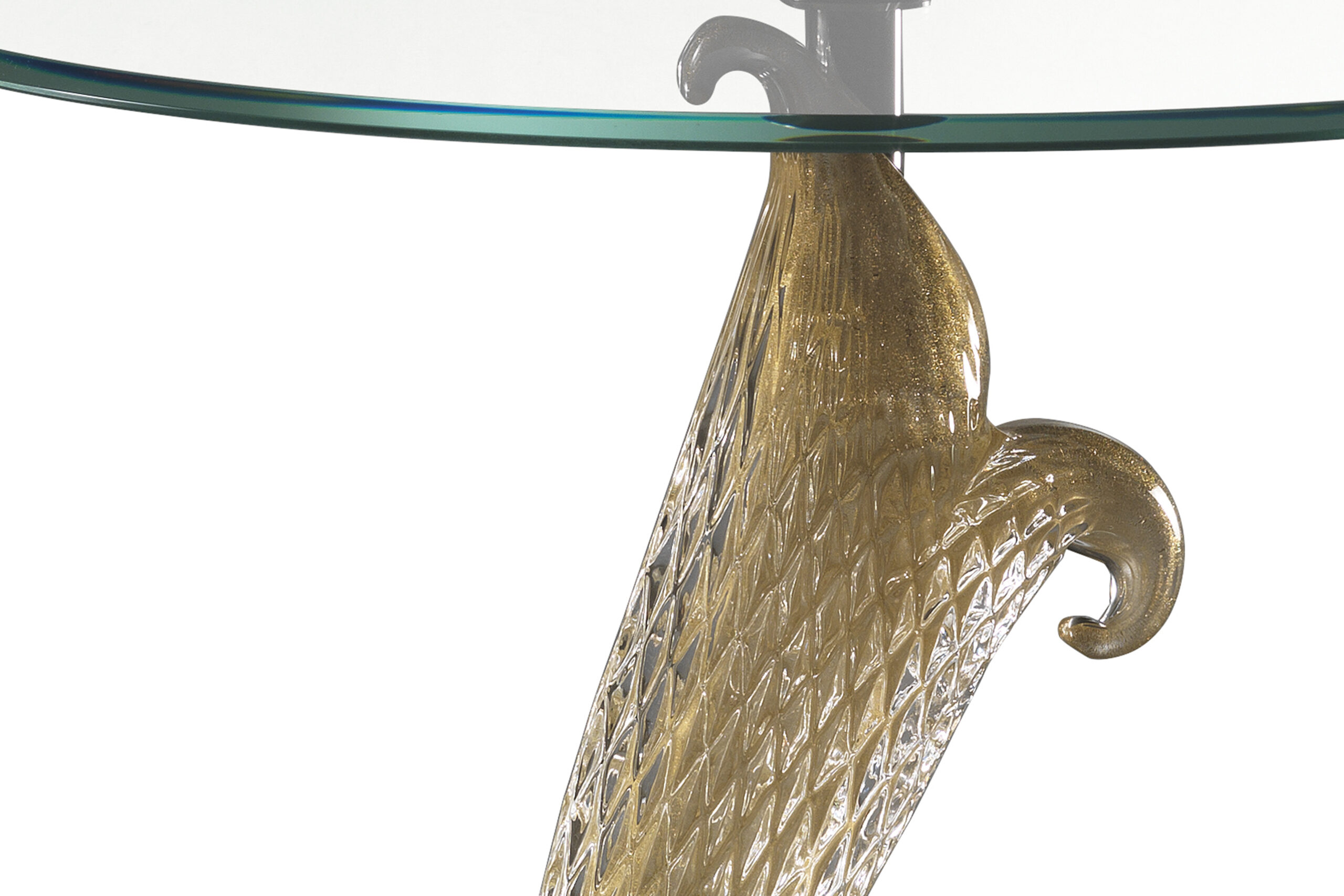 Console con struttura in legno rivestita in specchio extrachiaro, decori C e O in vetro di Murano su frontale e fianchi e gambe in vetro di Murano.