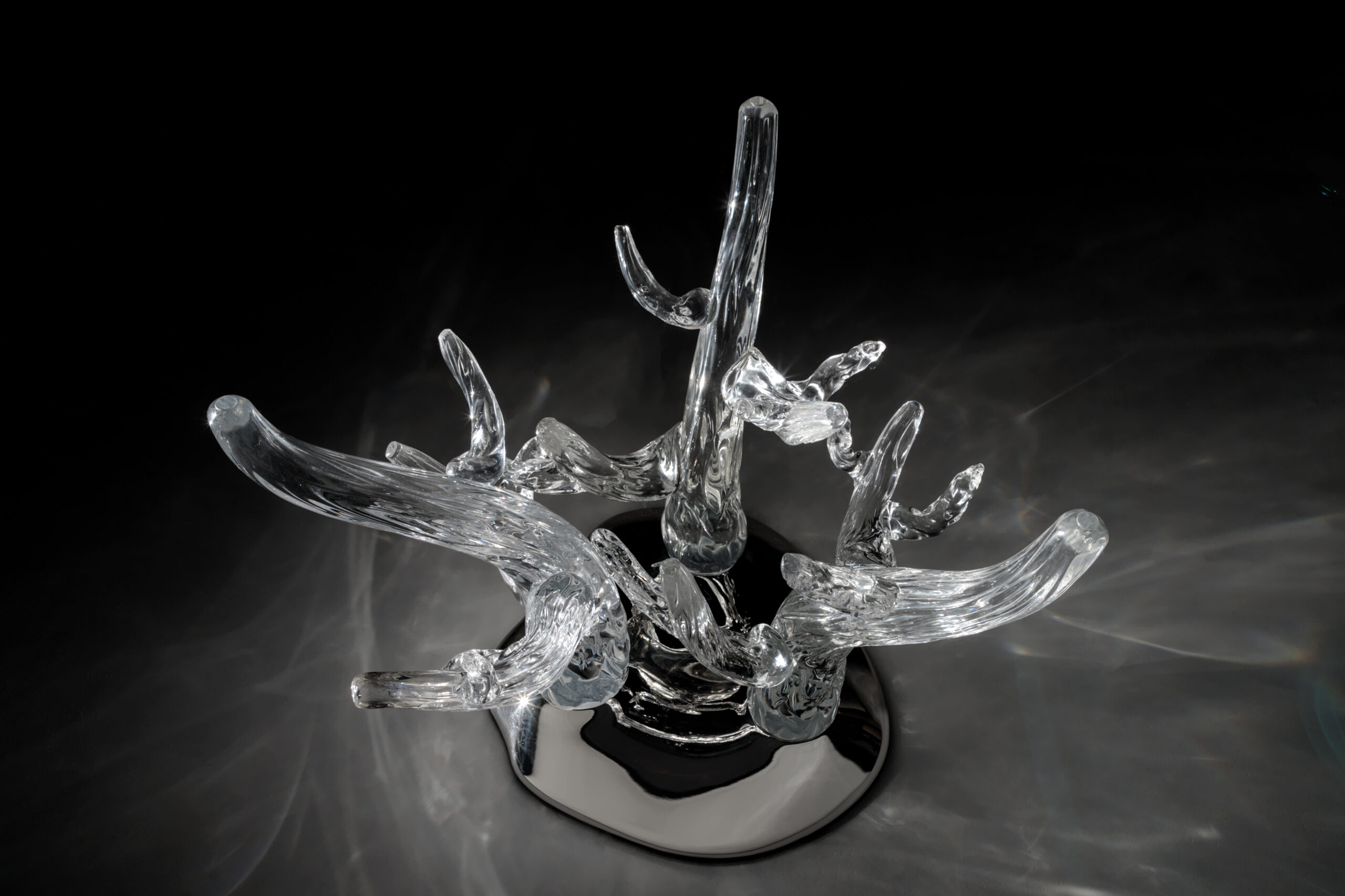 Tavolo da pranzo con basamento composto da elementi in vetro di Murano trasparente e zoccolo in finitura cromo, con piano in vetro.