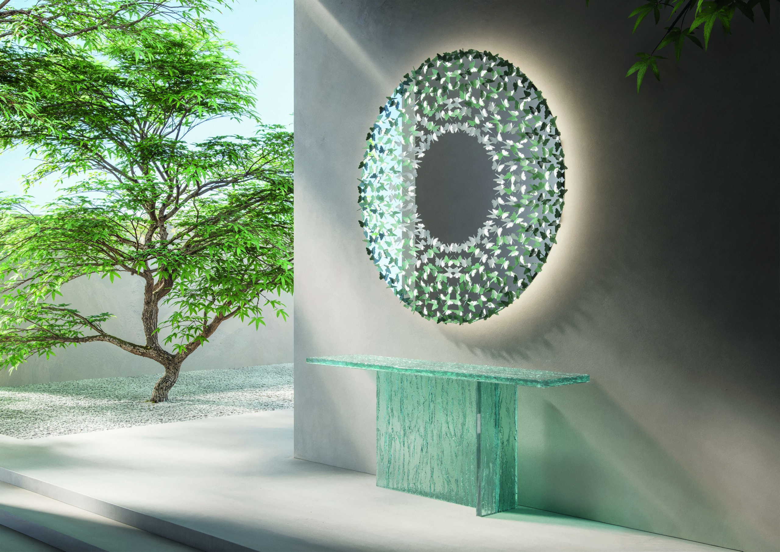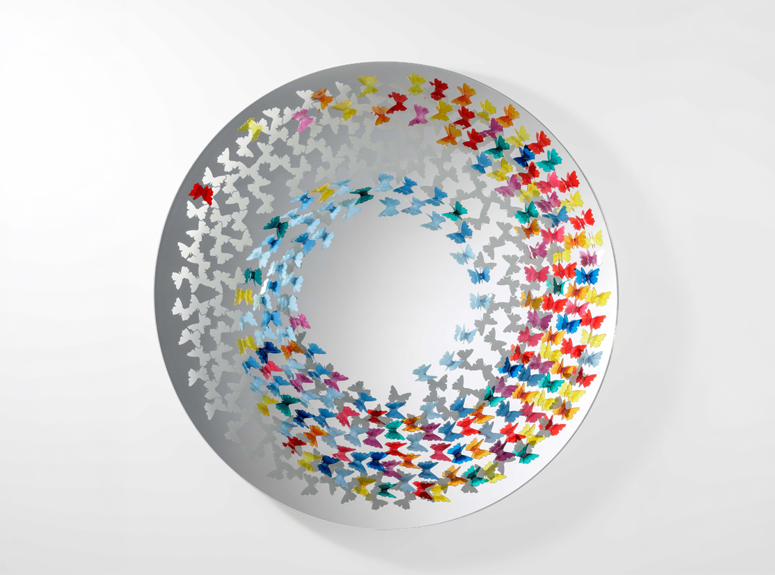 Specchio decorativo dal forte impatto emozionale, caratterizzato da una composizione di farfalle in vetro applicate su superficie riflettente extrachiara. La luce LED integrata valorizza la trasparenza del vetro e la vibrazione cromatica dei decori, trasformando lo specchio in un elemento scenografico oltre che funzionale.