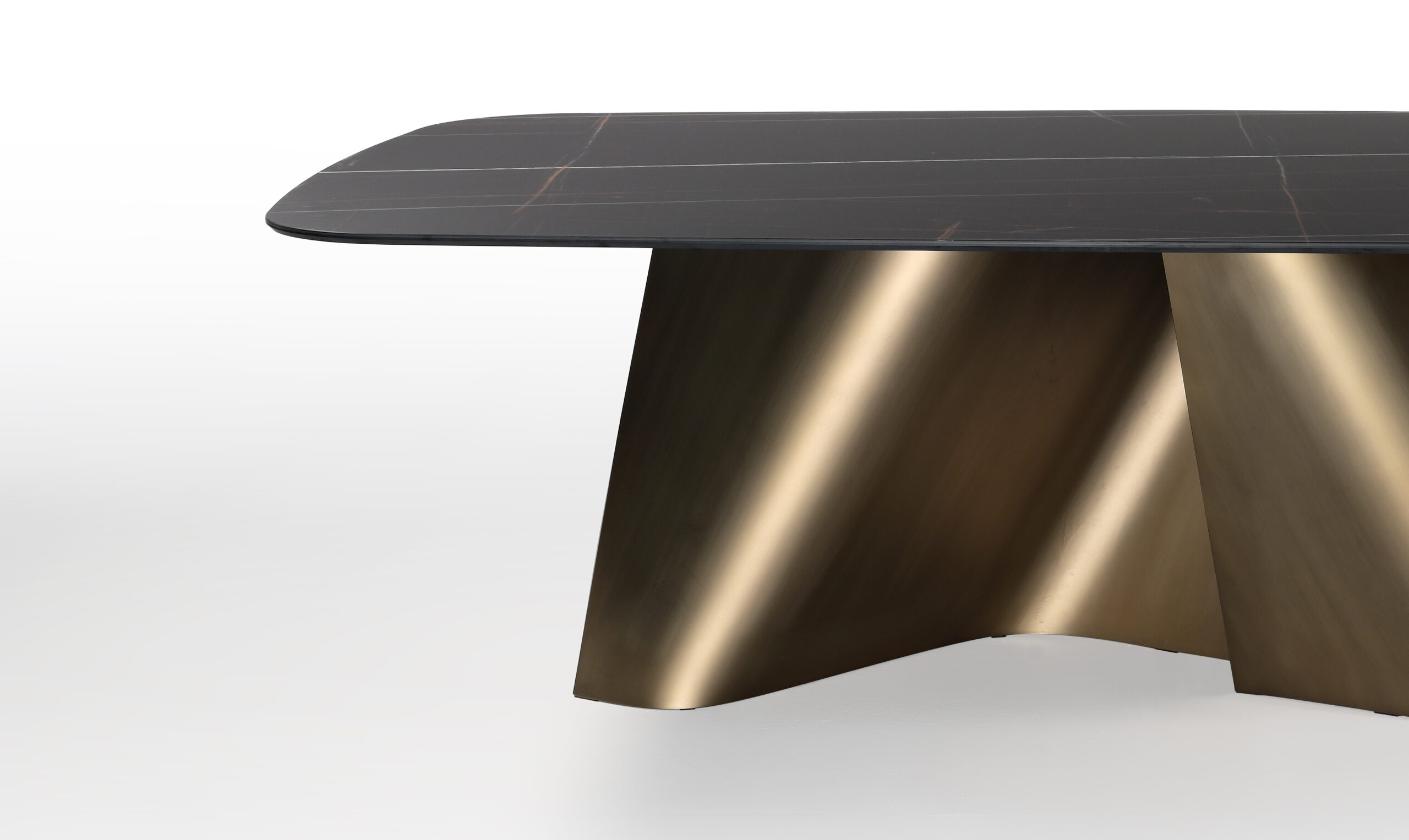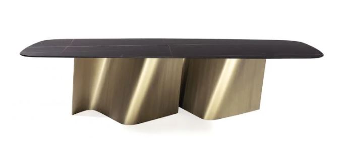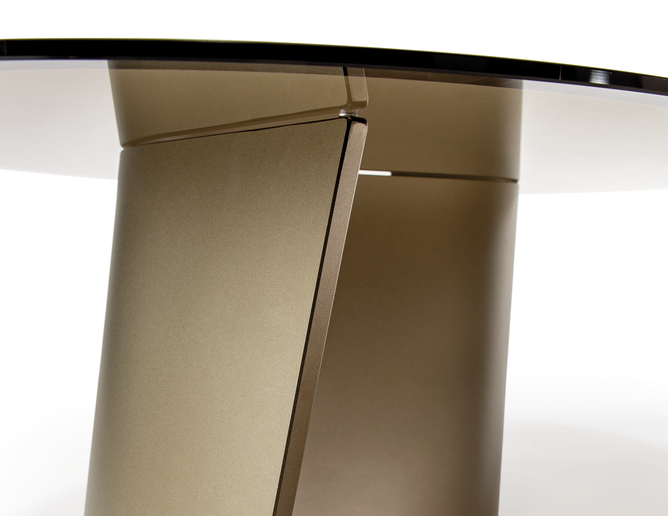 Tavolo da pranzo con basi curve e piano realizzati in vetro finitura Acqua.