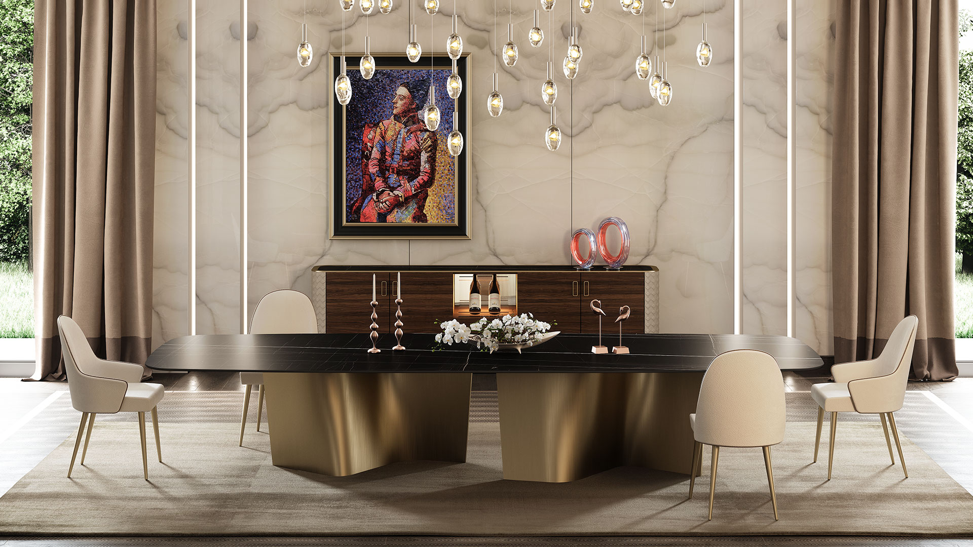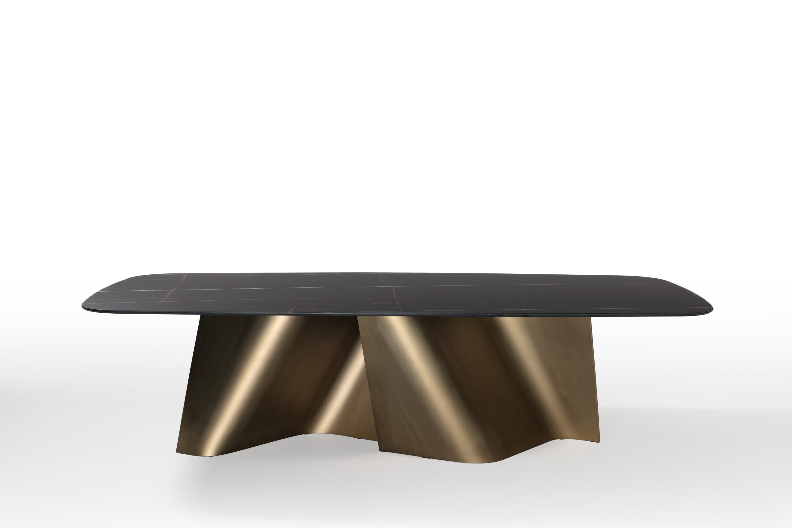 Tavolo da pranzo con basi in vetro extrachiaro curvato e piano disponibile in diverse finiture.