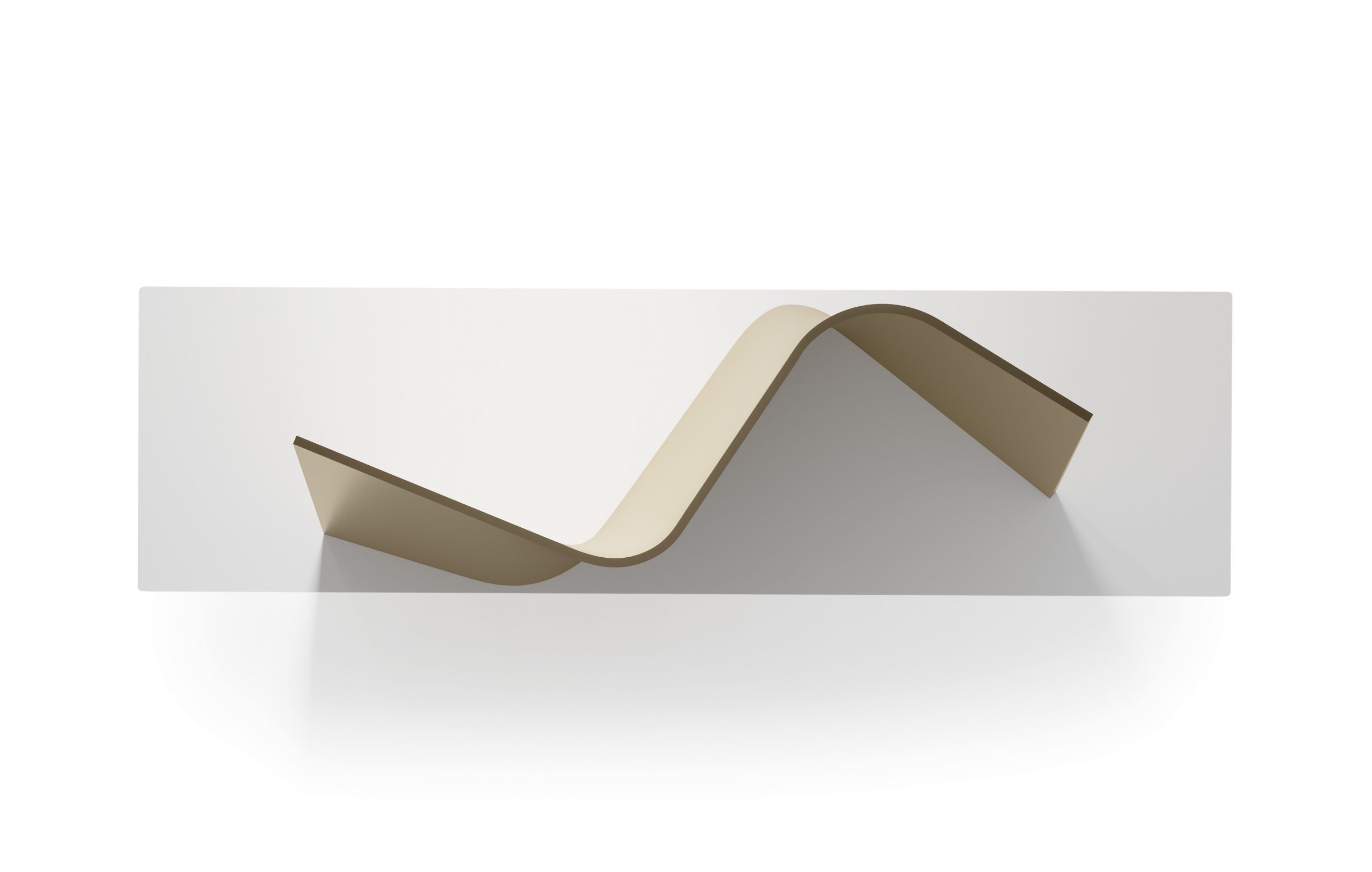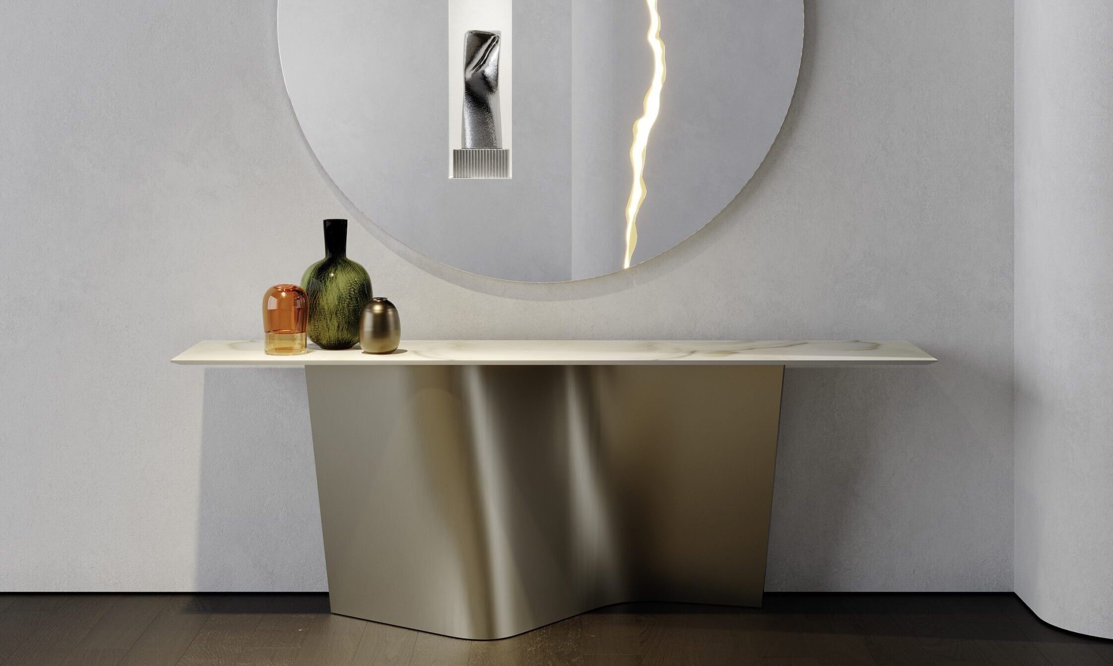 Console con base in vetro extrachiaro curvato, caratterizzata da un segno continuo e leggero che definisce struttura e identità del prodotto.