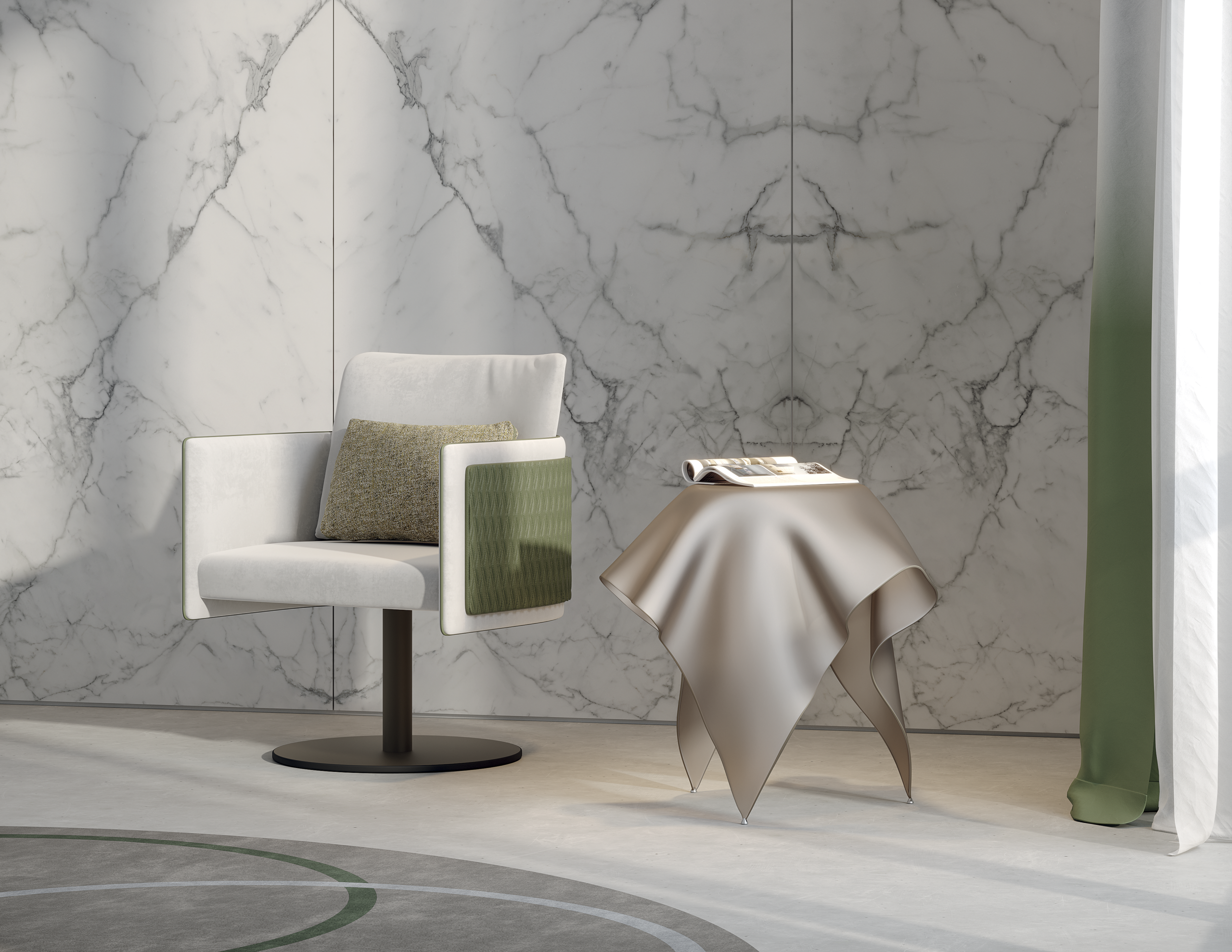 Tavolino caratterizzato da una struttura essenziale in vetro curvato, pensato come complemento leggero e versatile, con forte attenzione alle finiture superficiali.