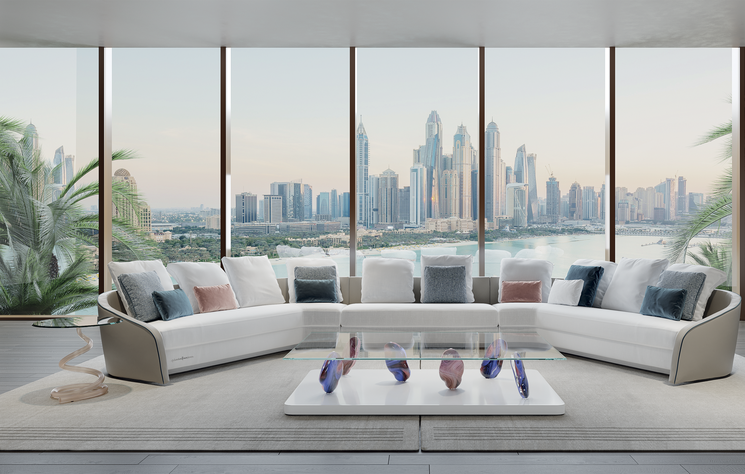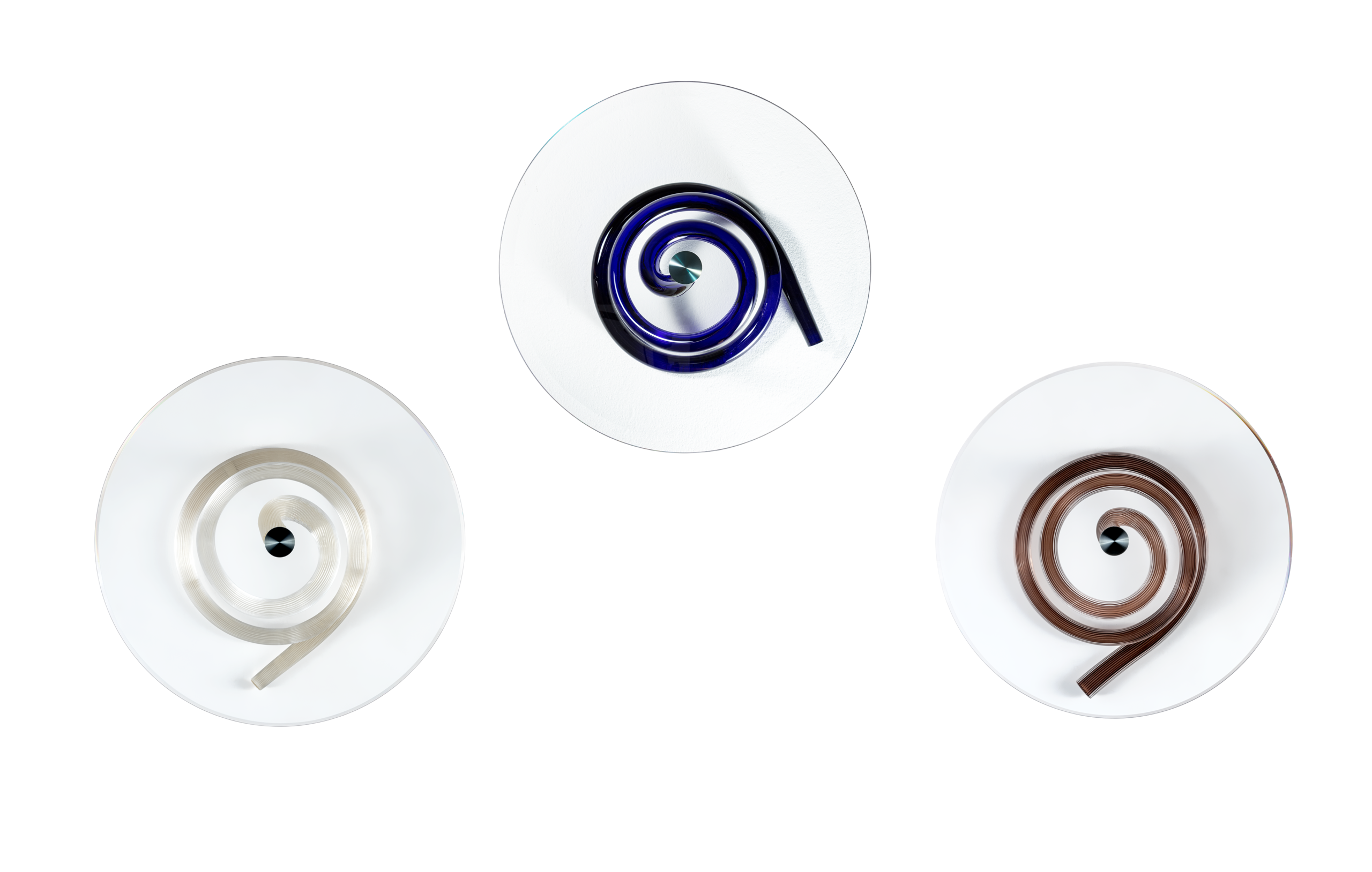 Tavolino con base in vetro di Murano rigato e piano in vetro, disponibile in diverse varianti cromatiche.