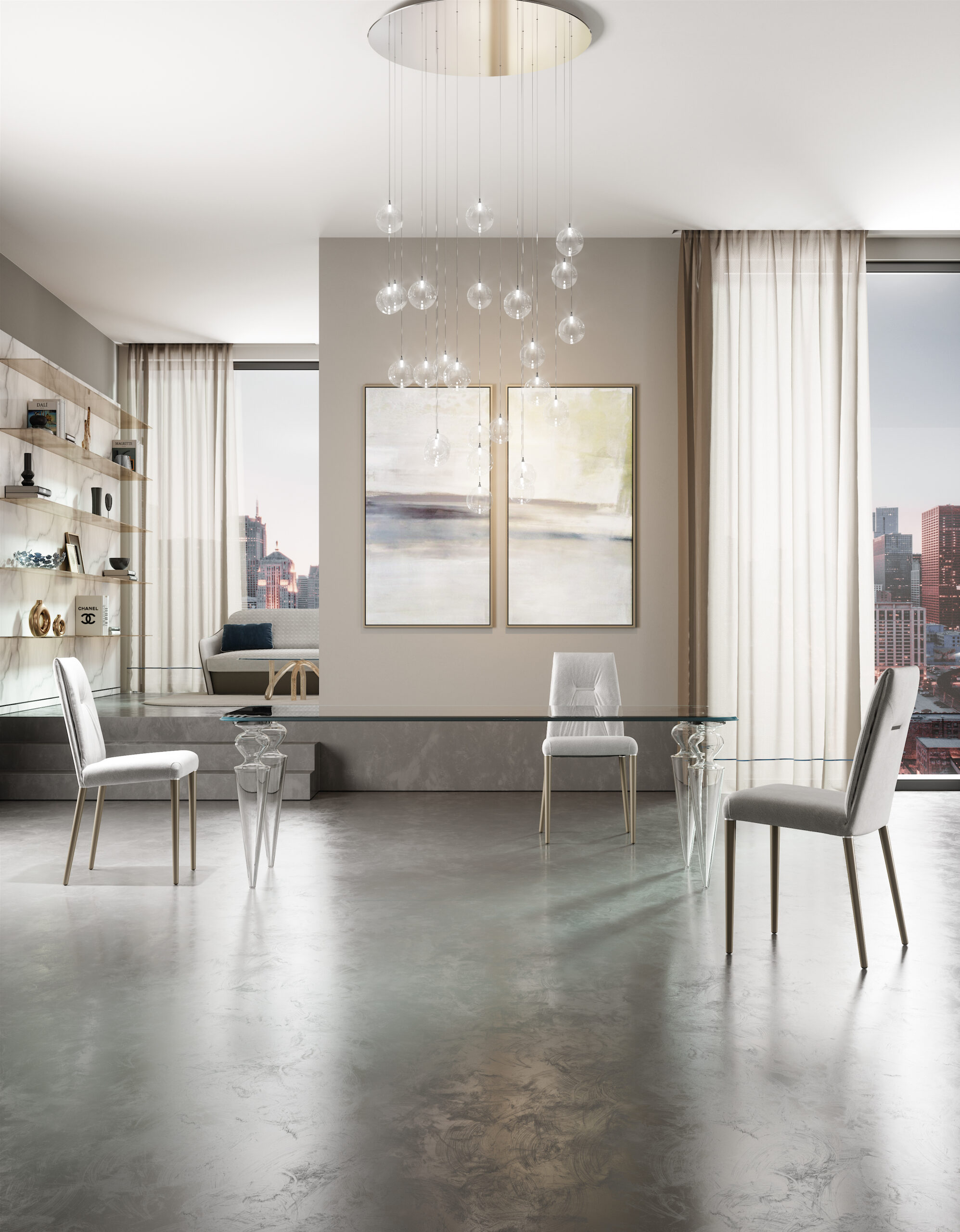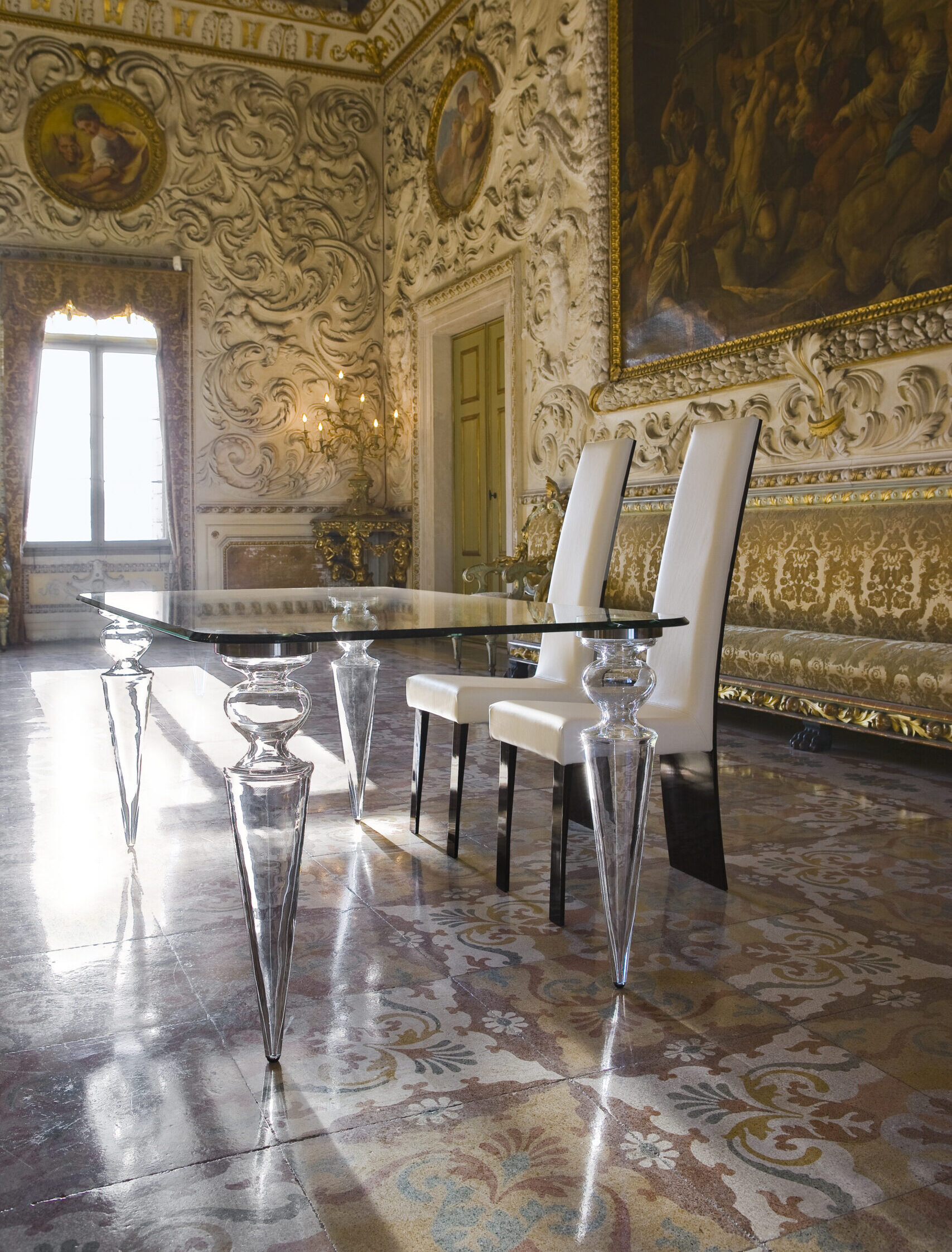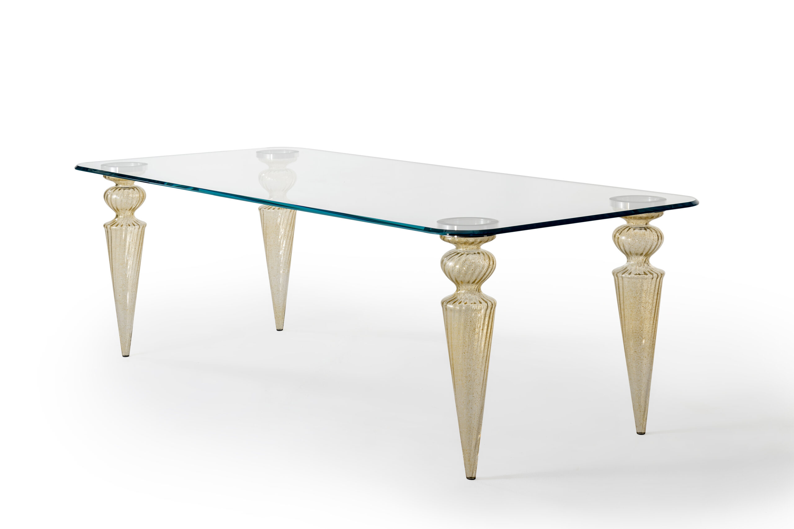 Tavolo da pranzo con gambe in vetro di Murano liscio e placche di fissaggio in acciaio.