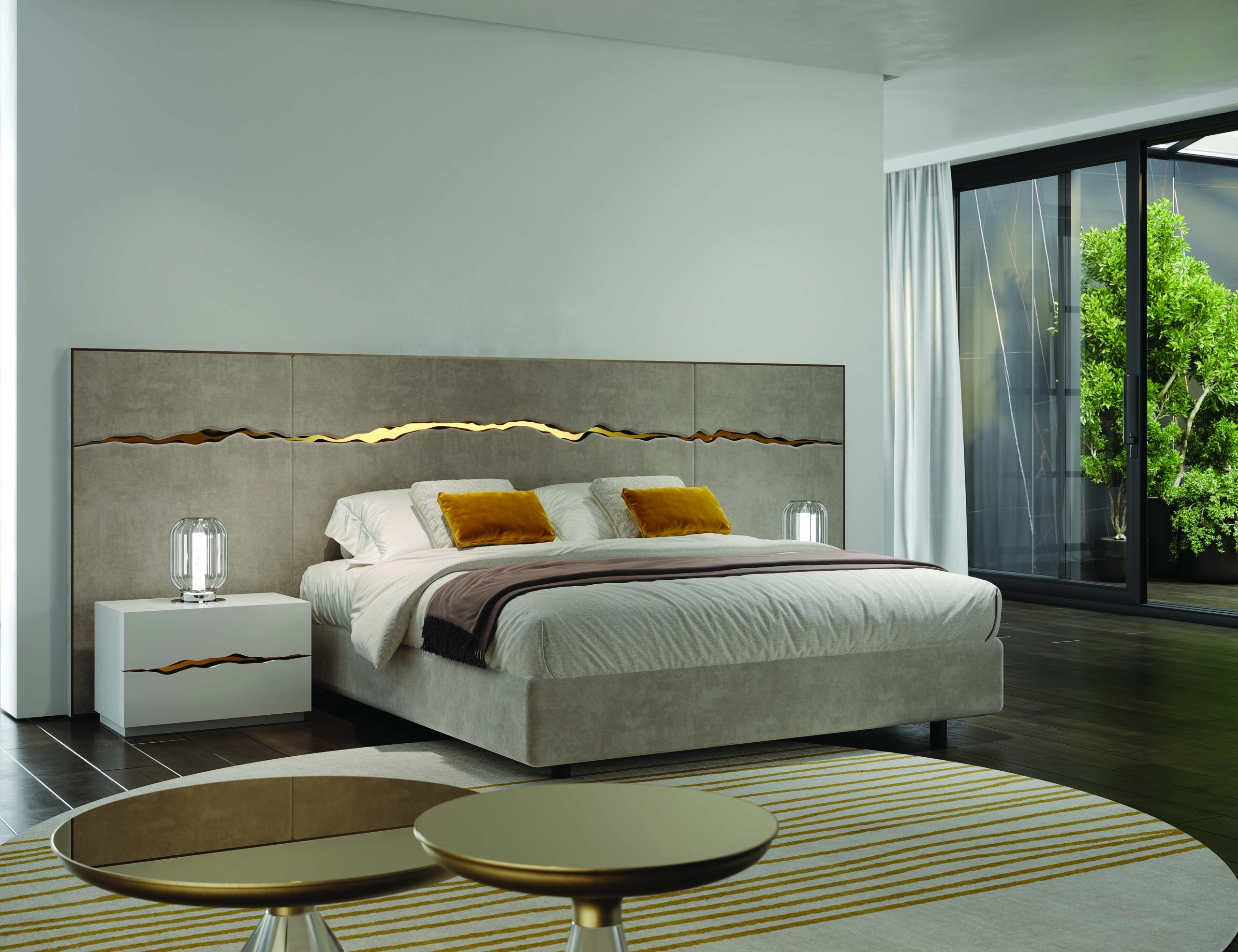 Letto con struttura in legno caratterizzato da una testiera ampia e da sezioni laterali imbottite che avvolgono il piano di riposo. Il rivestimento in pelle è incorniciato da un profilo in legno con finitura metallica, elemento distintivo del progetto. Il giroletto è liscio, a sottolineare il contrasto tra superfici morbide e dettagli decorativi. Rete non compresa.