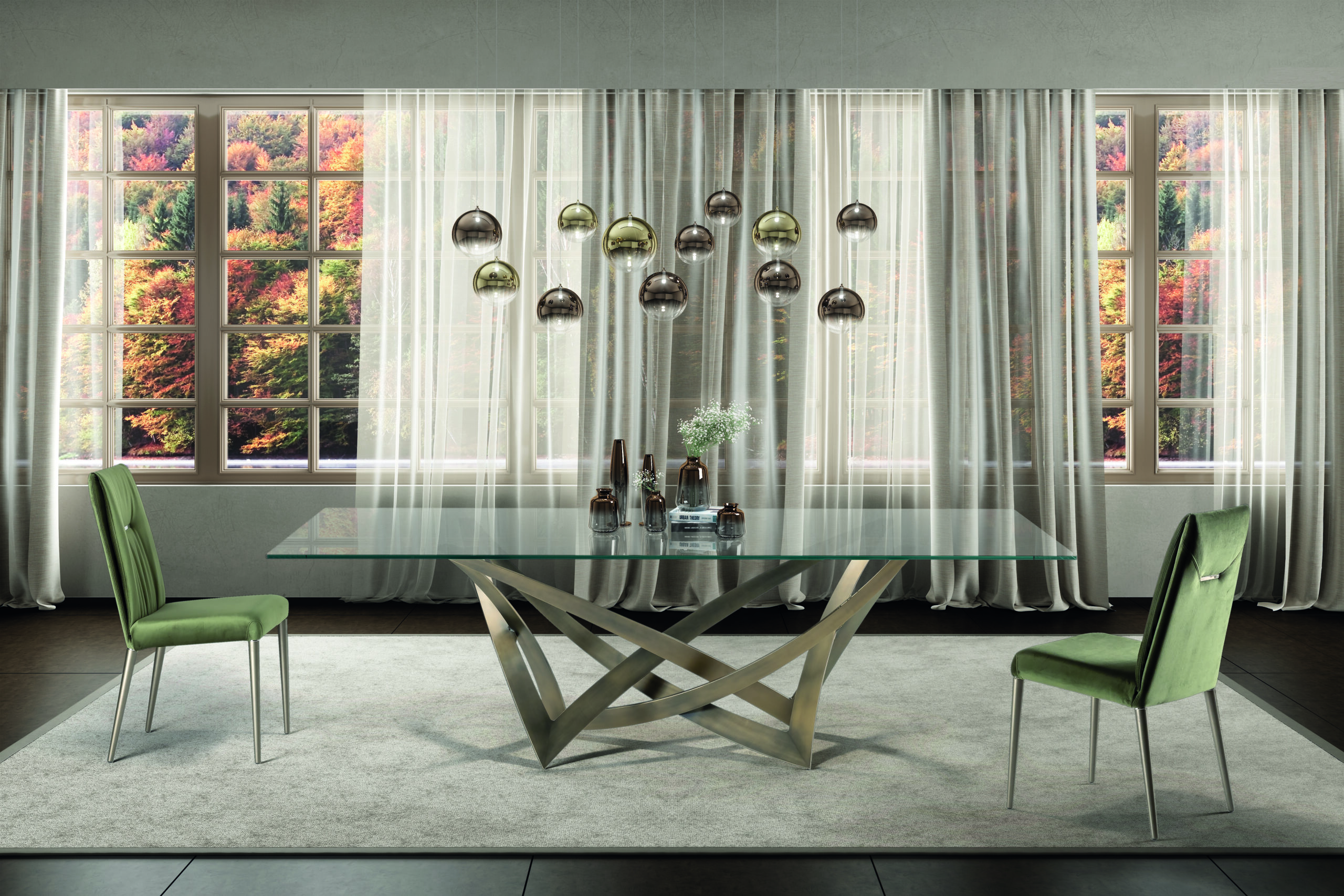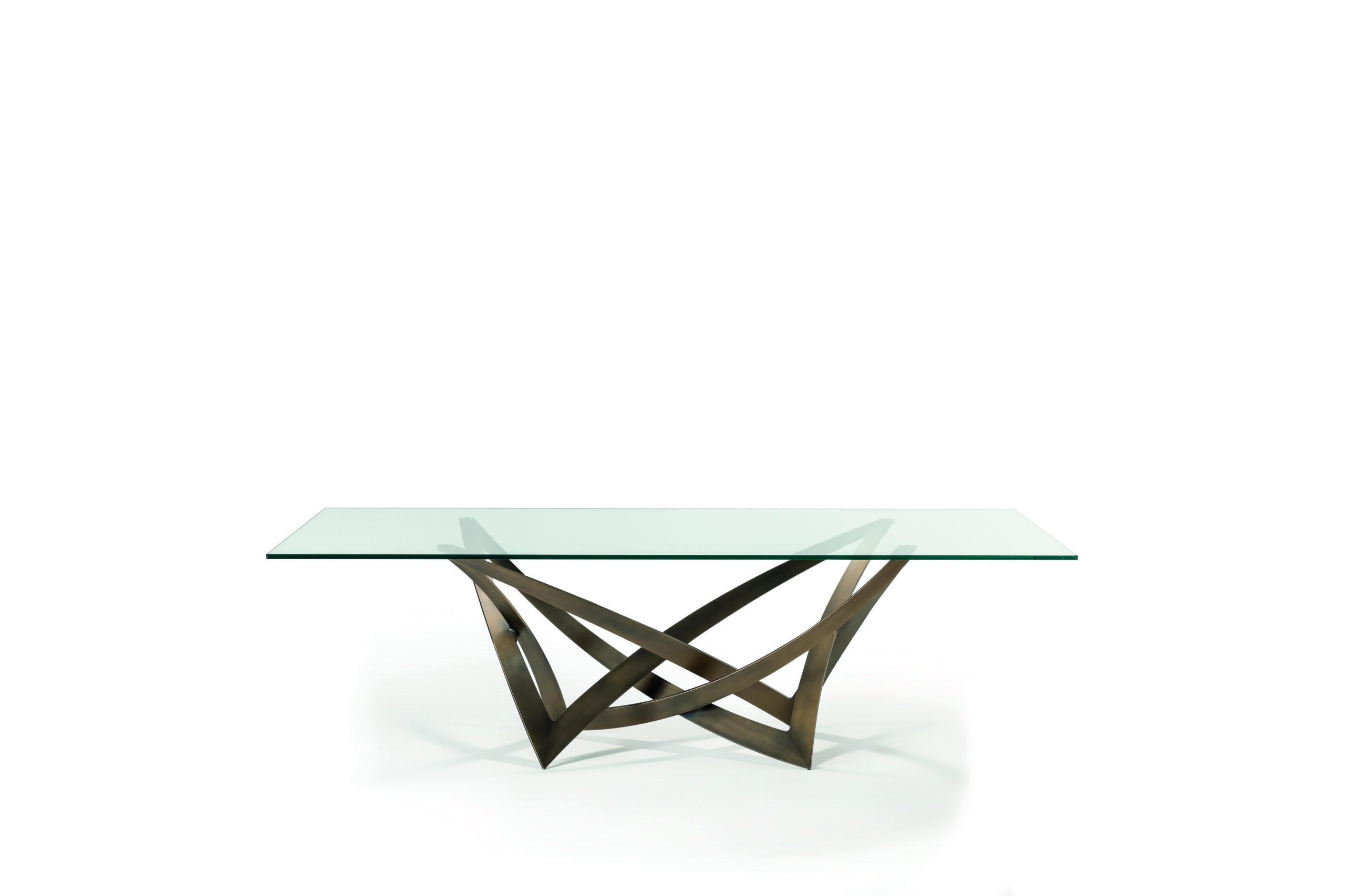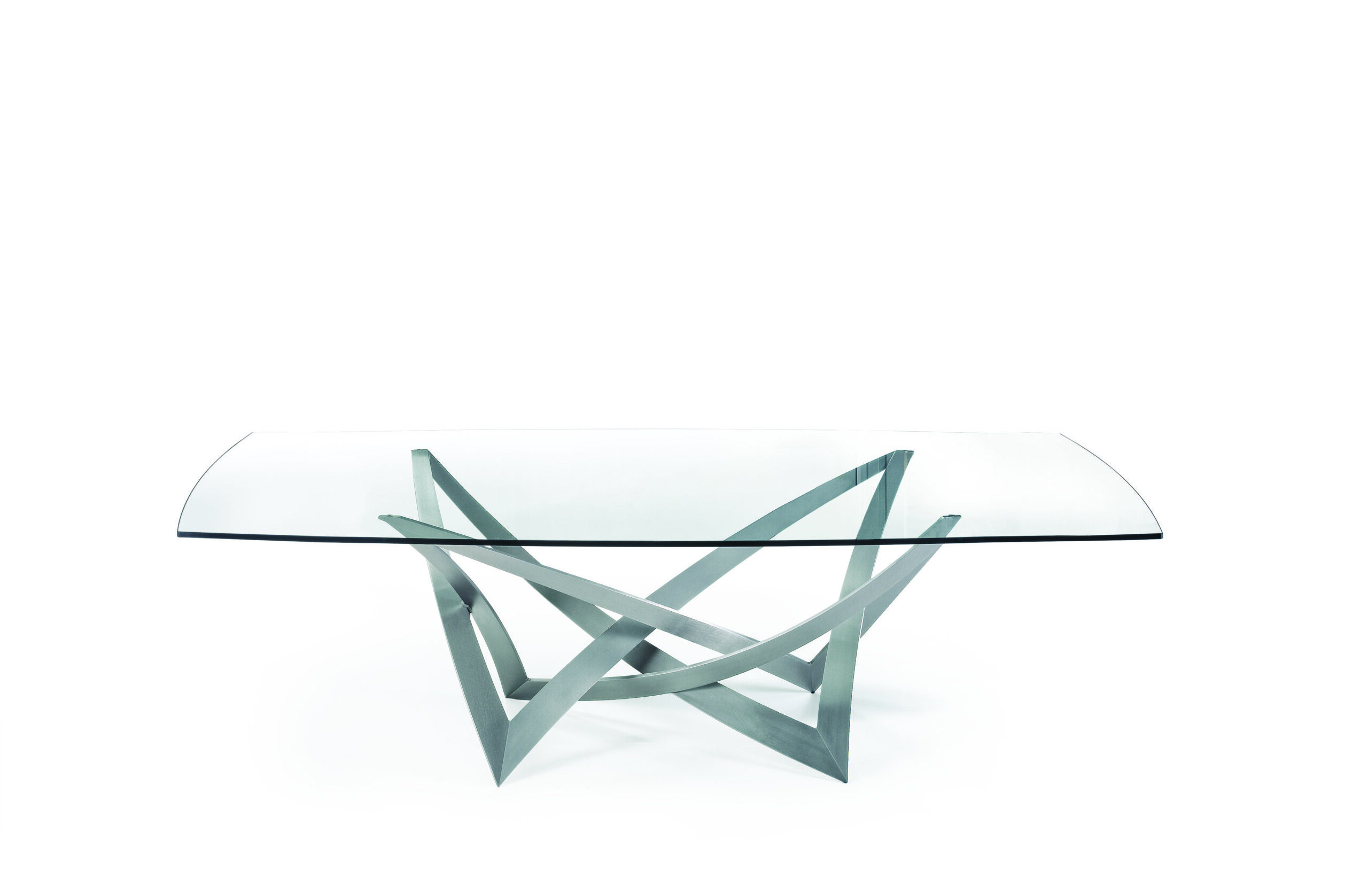 Tavolo da pranzo con base in ferro battuto e piano in vetro.