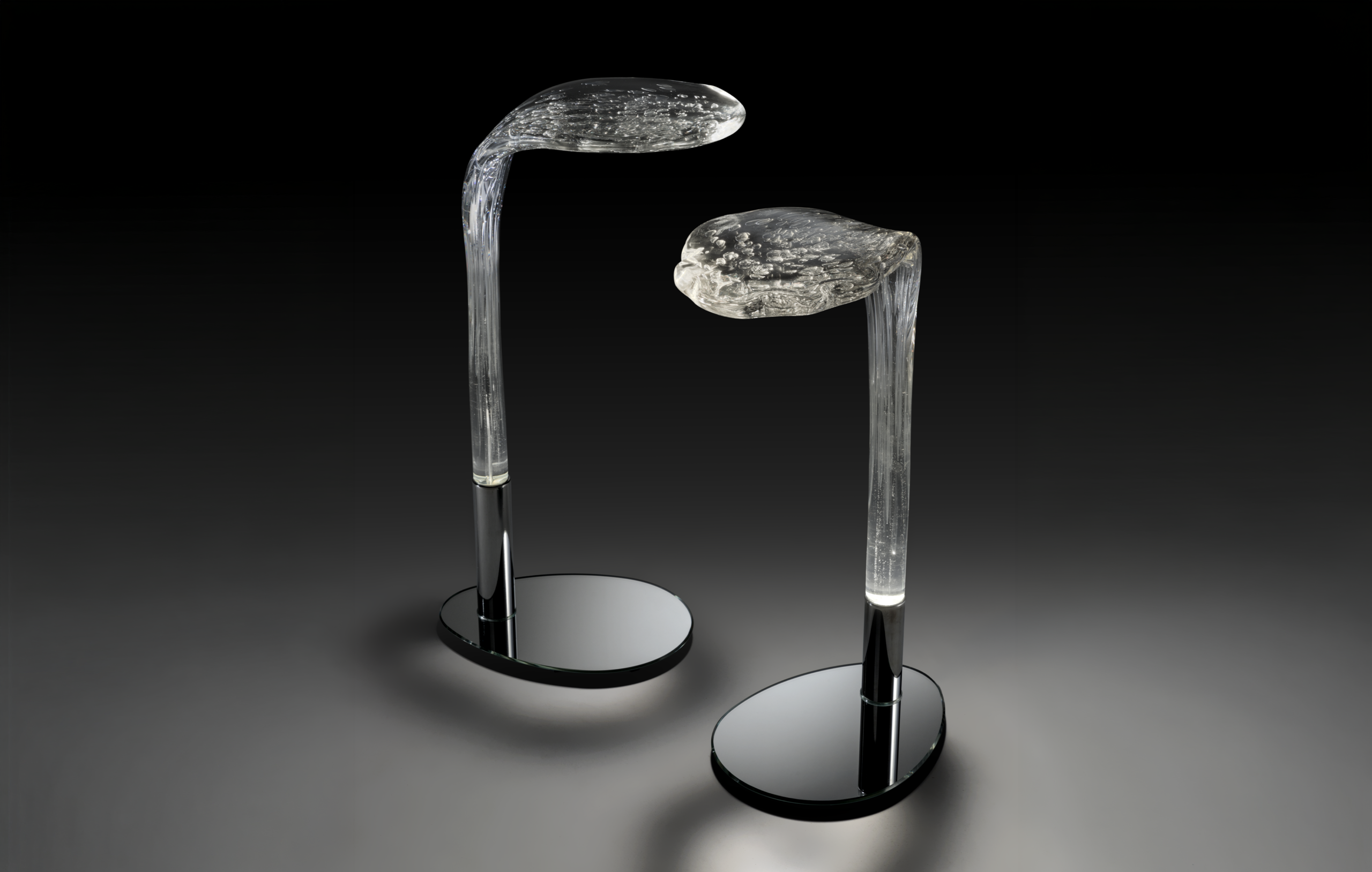 Tavolino/lampada con corpo in vetro di Murano trasparente, base in specchio extrachiaro e supporto in acciaio lucido, con illuminazione integrata.