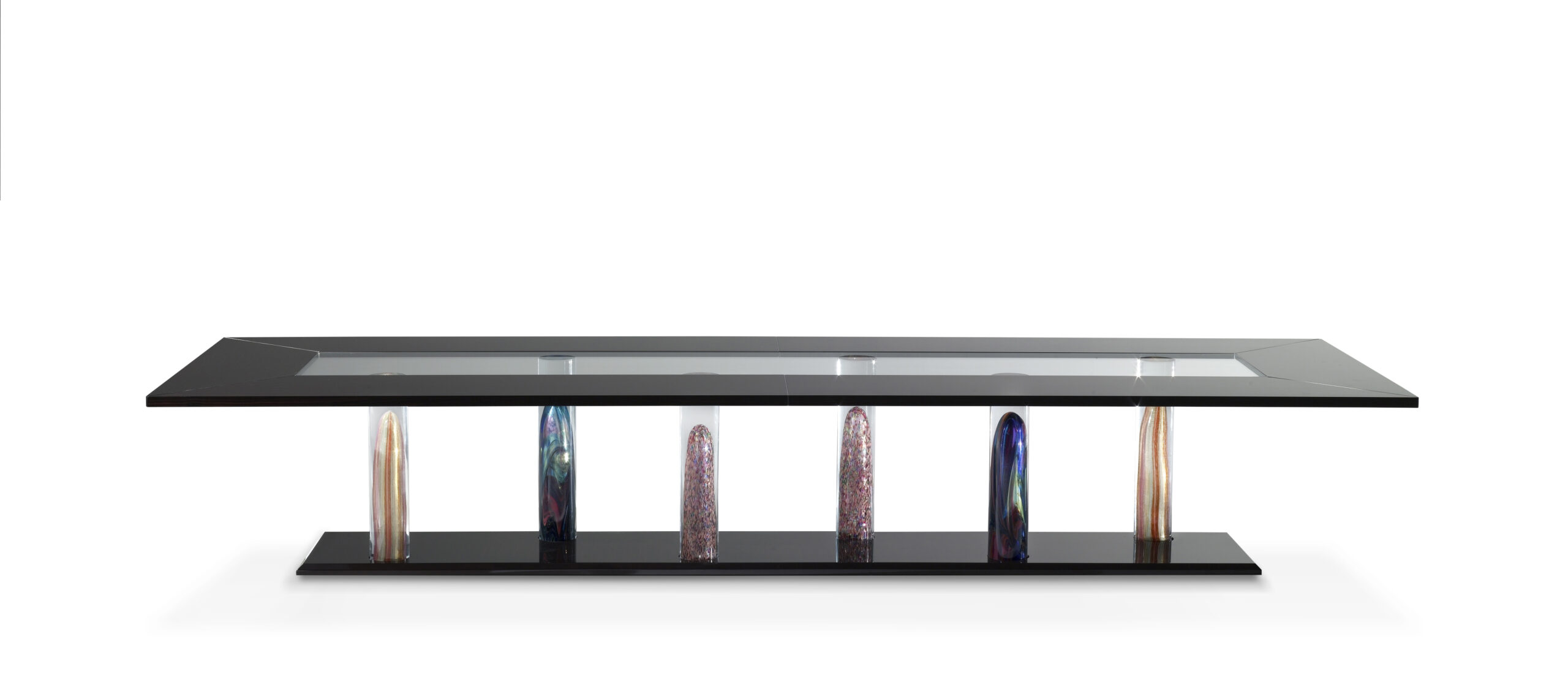 Tavolo da pranzo con base composta da quattro cilindri in vetro di Murano e piano in vetro.