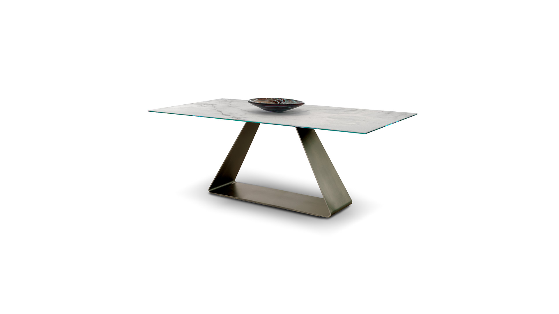Tavolo da pranzo con base in metallo piegato e piano disponibile in diverse configurazioni materiche.