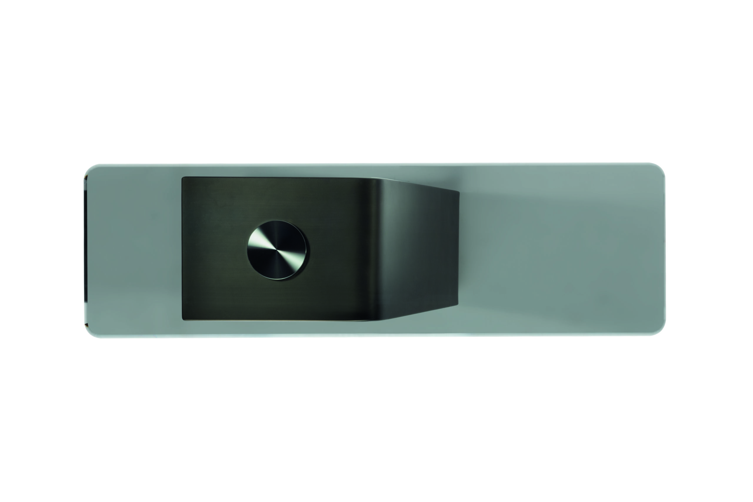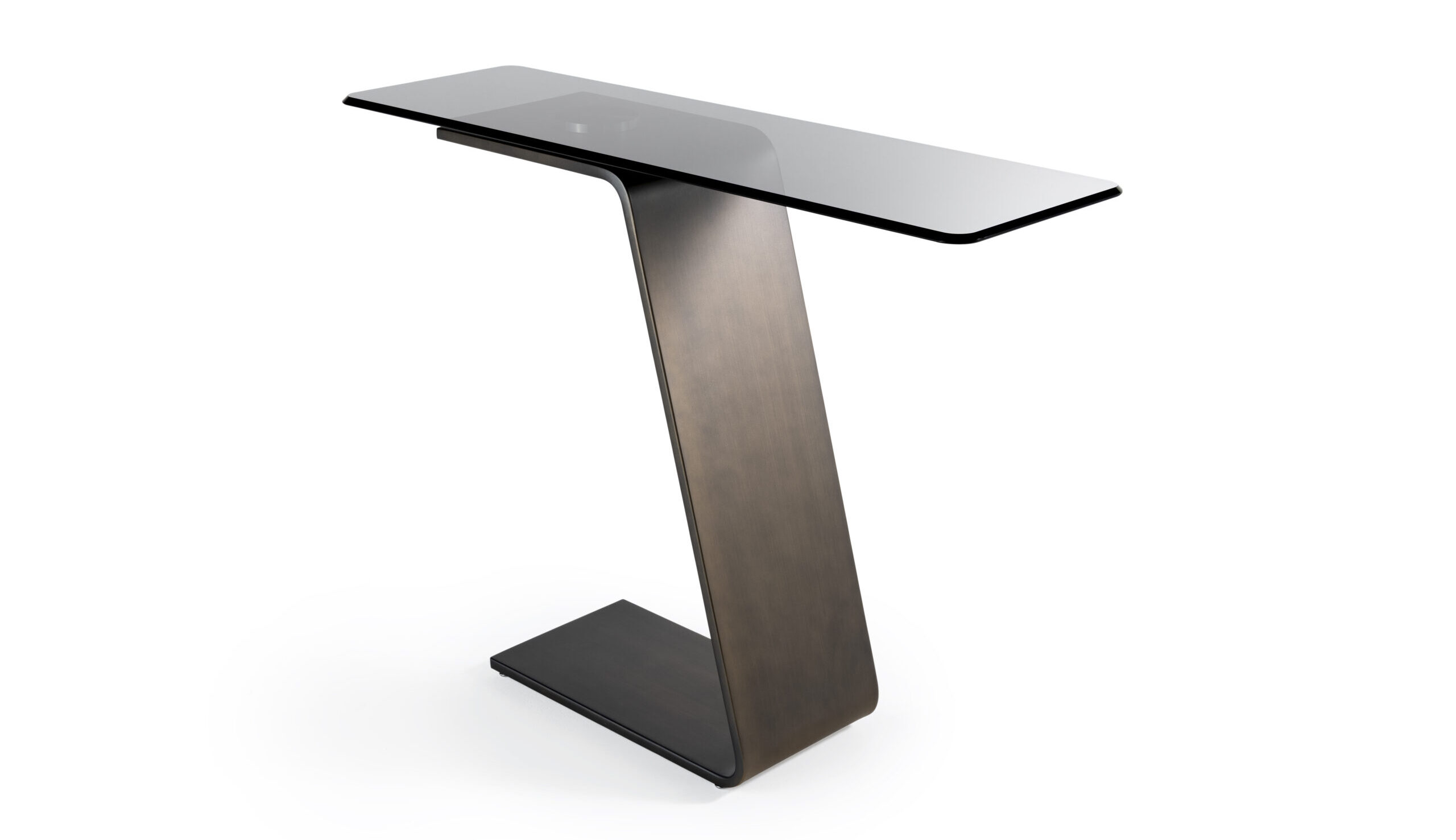 Console con base in vetro curvato e piano disponibile in diverse configurazioni materiche.