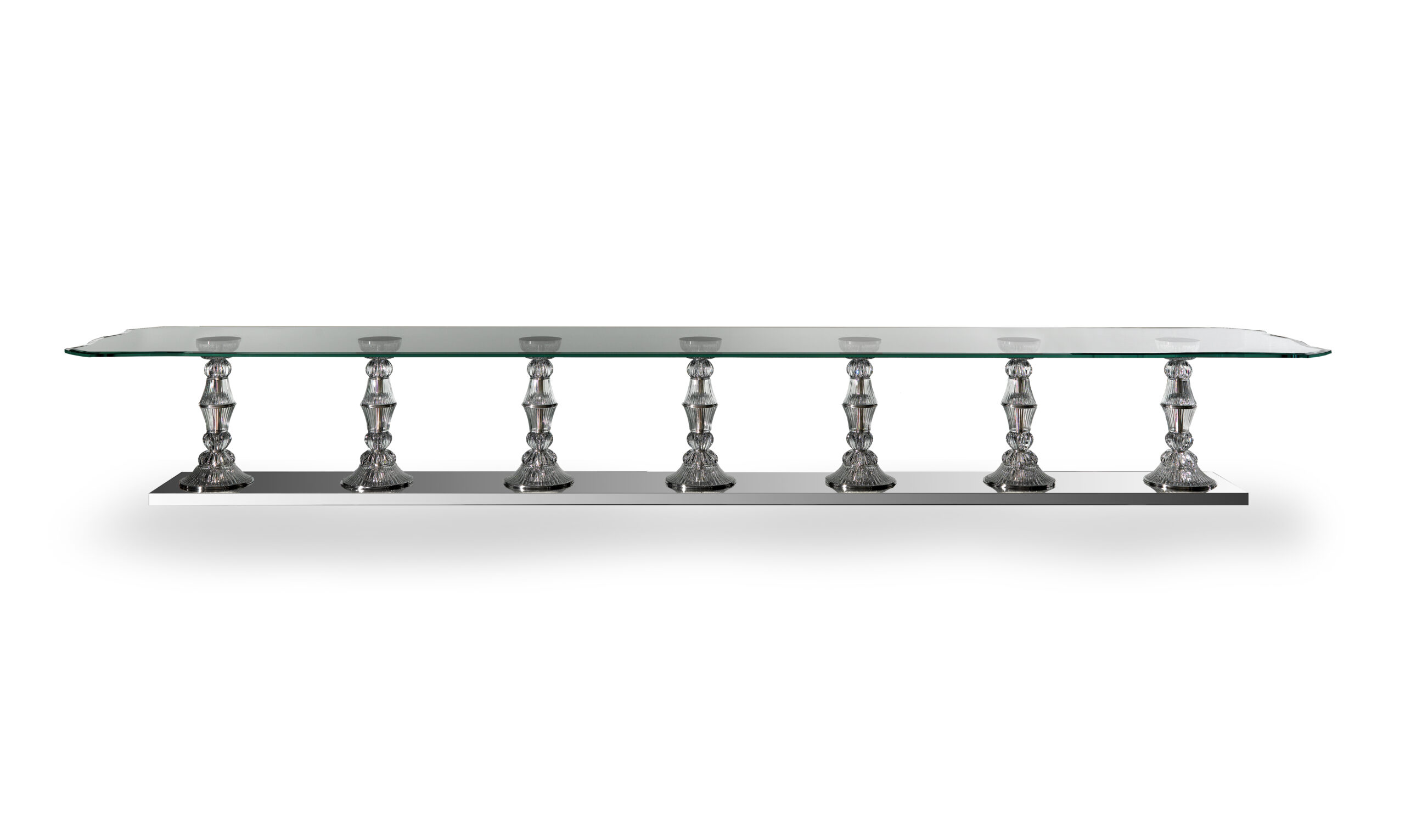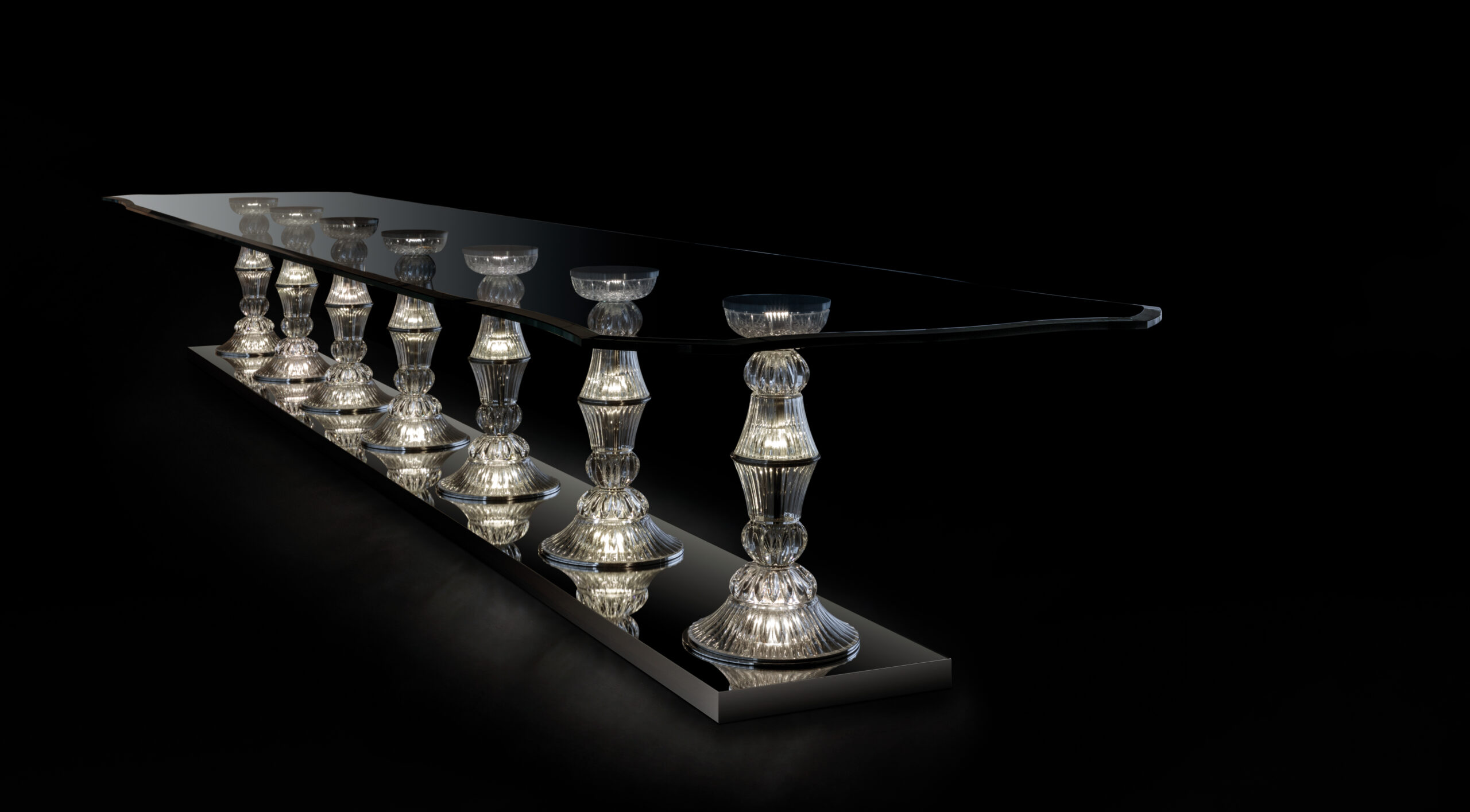 Tavolo da pranzo con basi ad elementi in cristallo inciso e piano in vetro extrachiaro sagomato. Il progetto è caratterizzato dall’integrazione dell’illuminazione LED in ogni base, elemento funzionale e scenografico.
