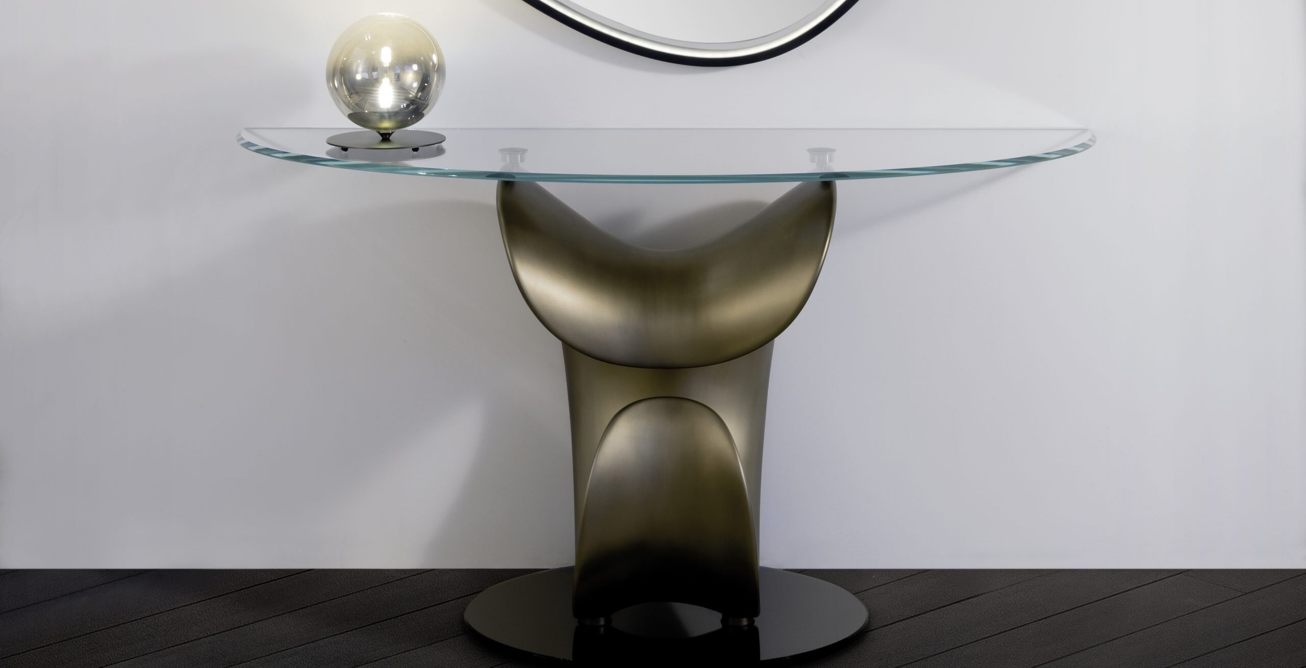 Console con base metallica e zoccolo in vetro specchio fumé, caratterizzata da un piano in vetro extrachiaro con bisello.