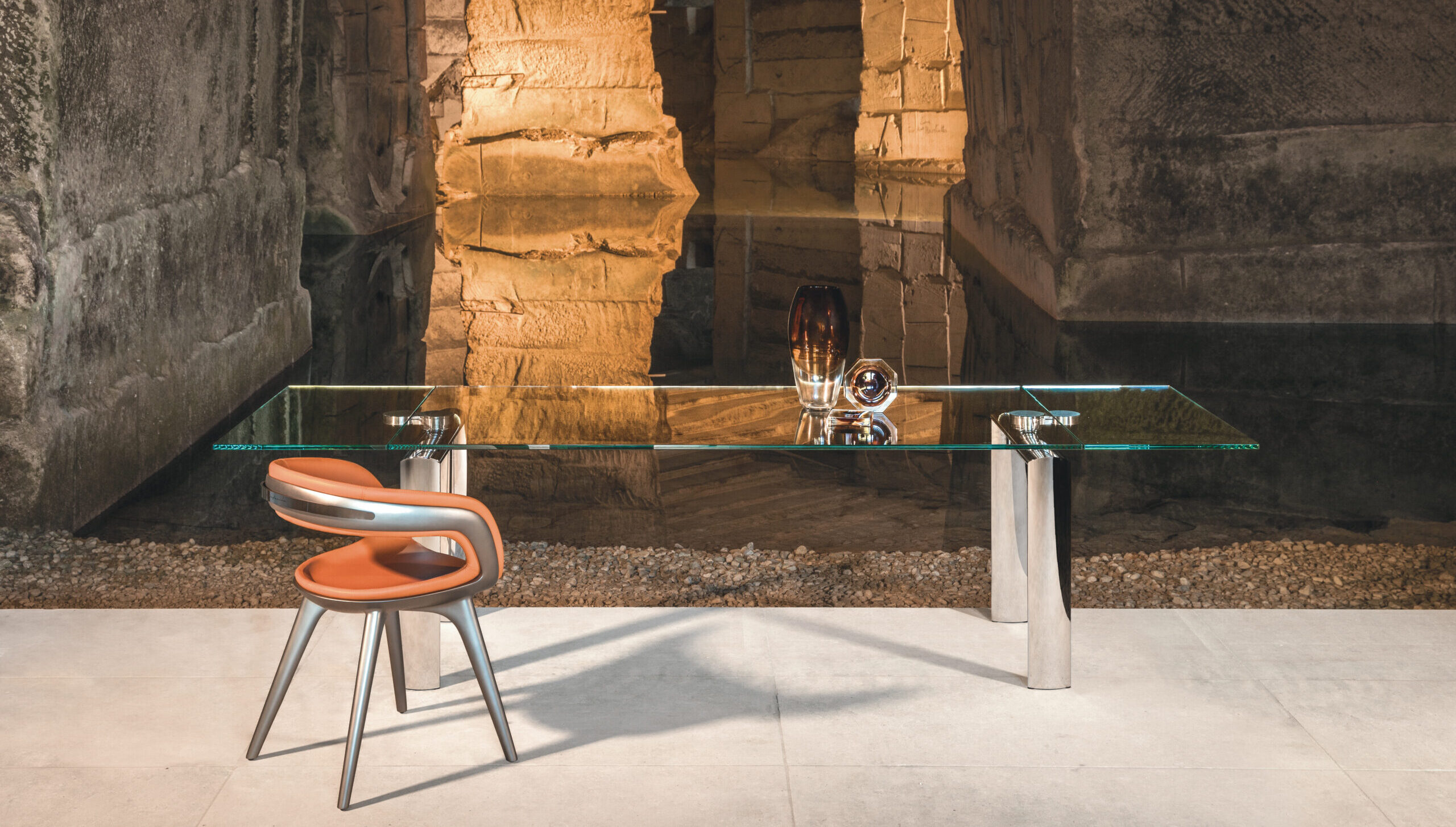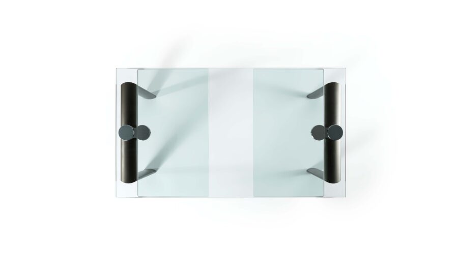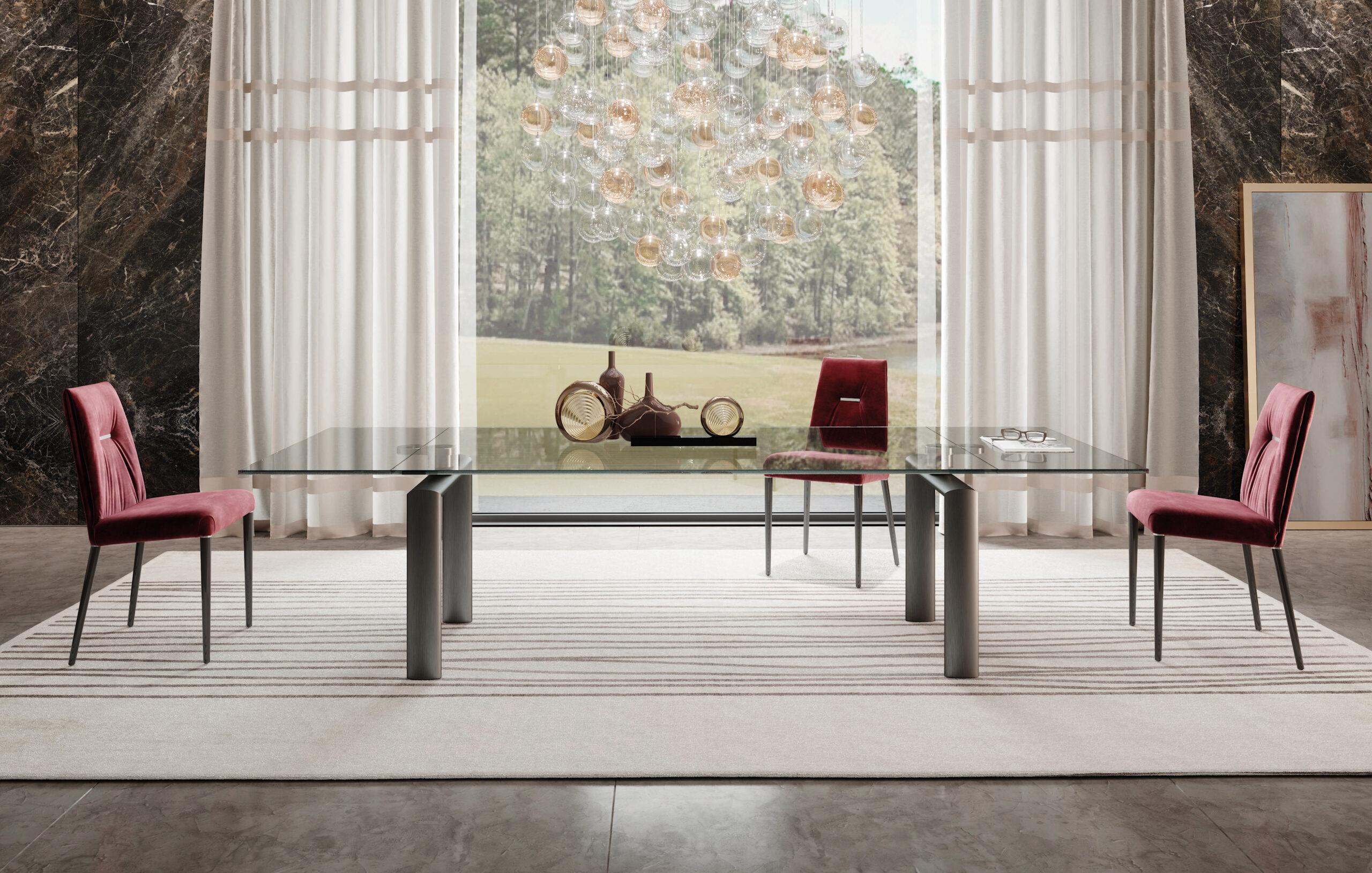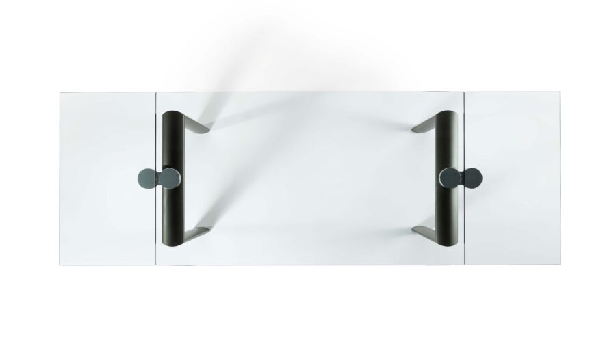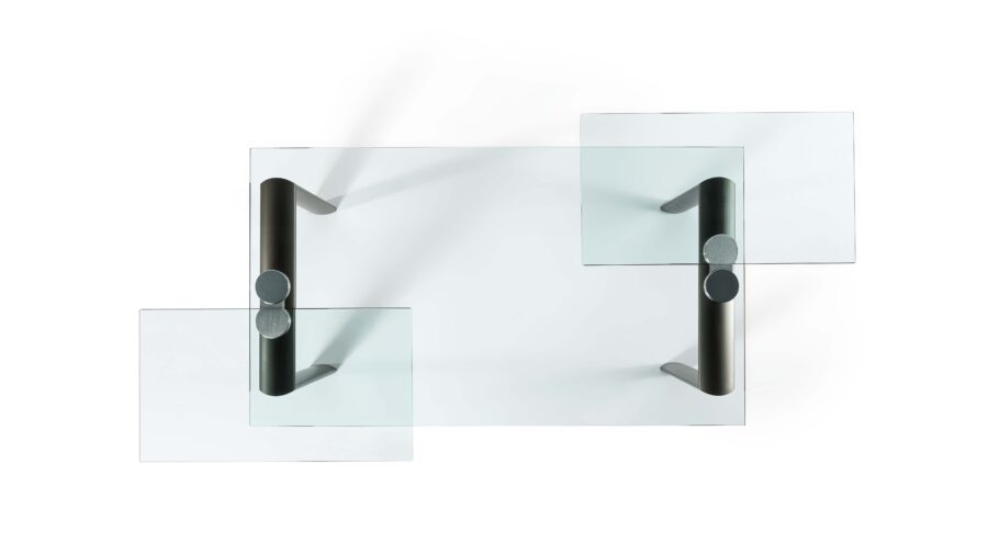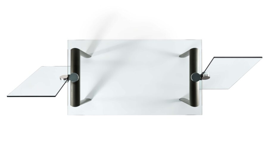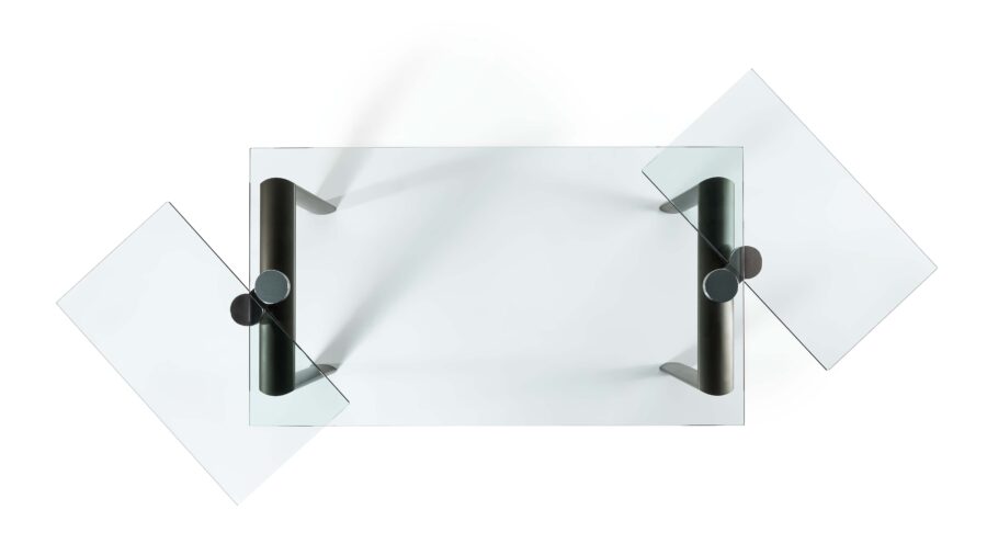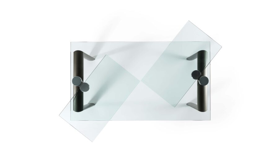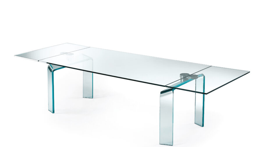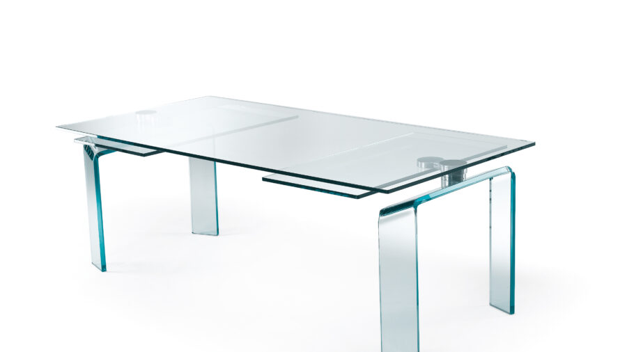 Tavolo da pranzo allungabile con meccanismo Policleto, caratterizzato da una struttura elegante e da un’ampia possibilità di configurazione di gambe e piani.