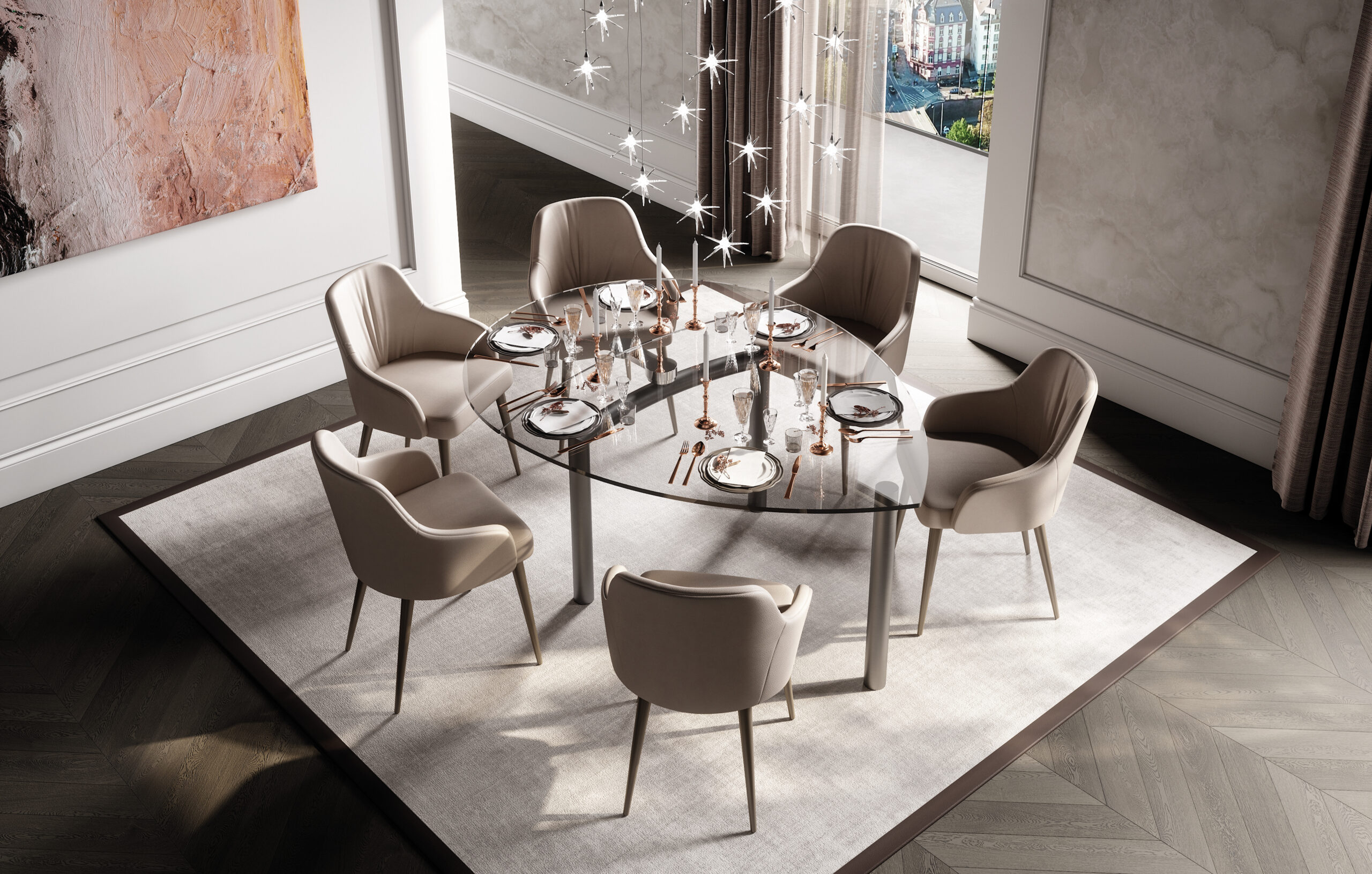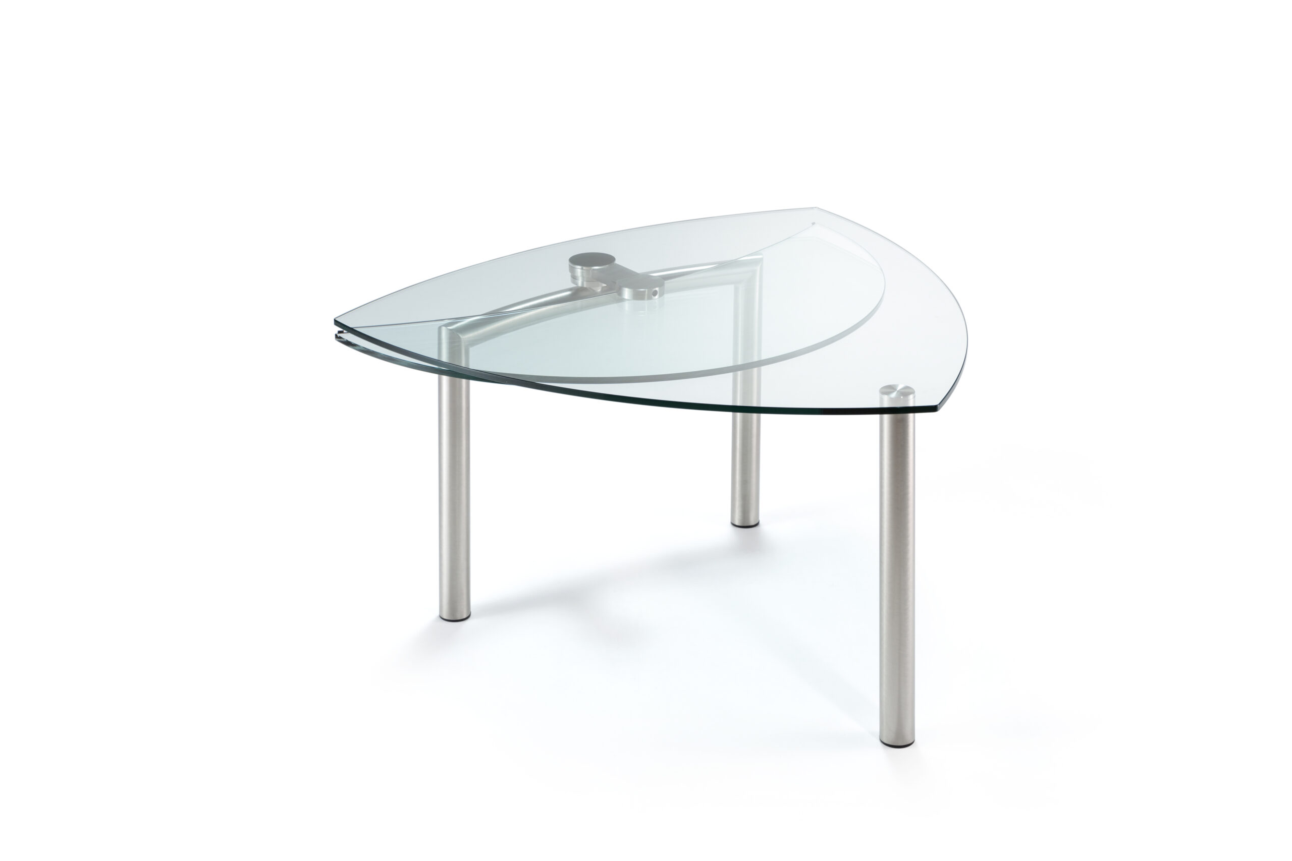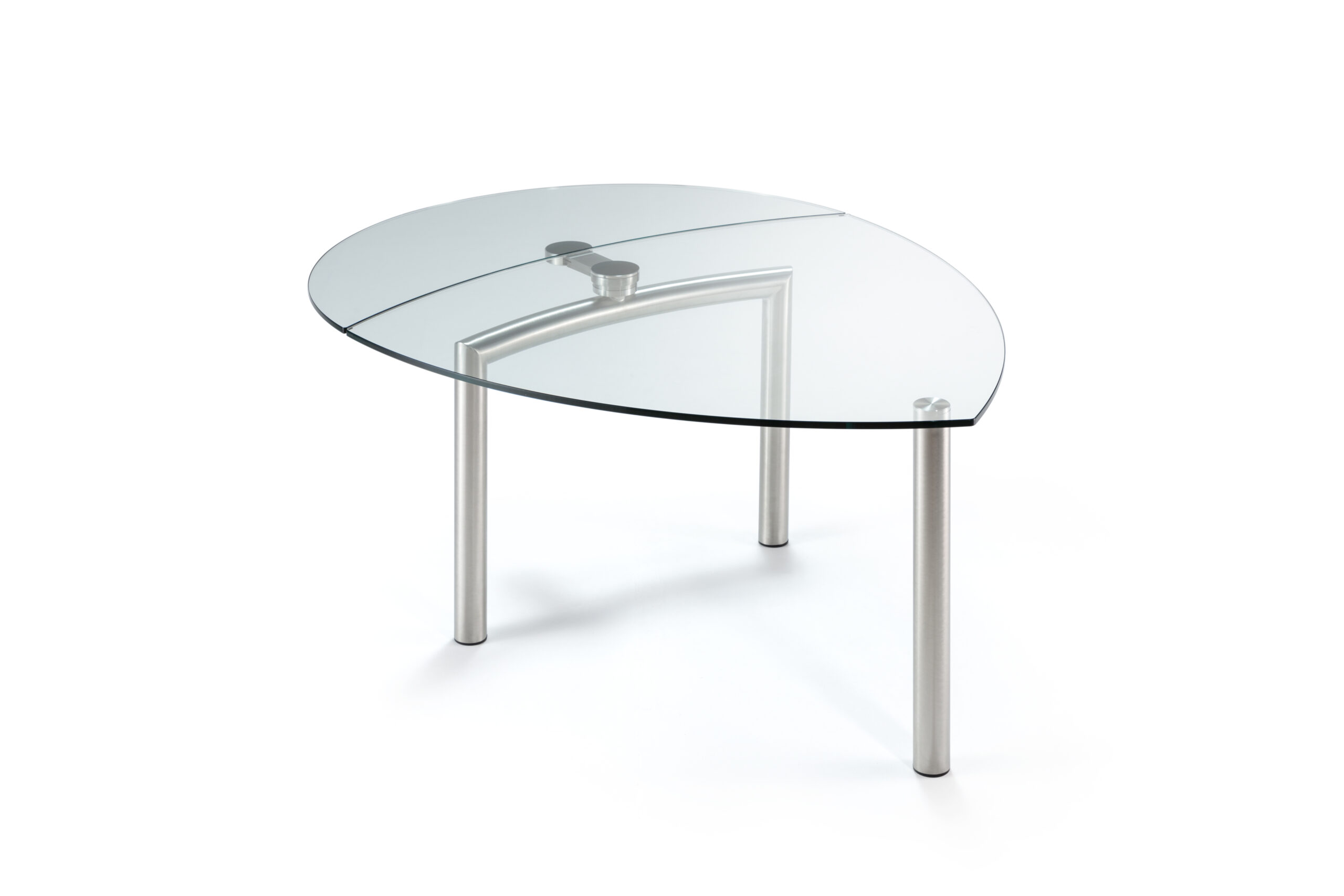 Tavolo da pranzo allungabile con piano sagomato a goccia in vetro, caratterizzato da una struttura essenziale e da una configurazione tecnica definita.