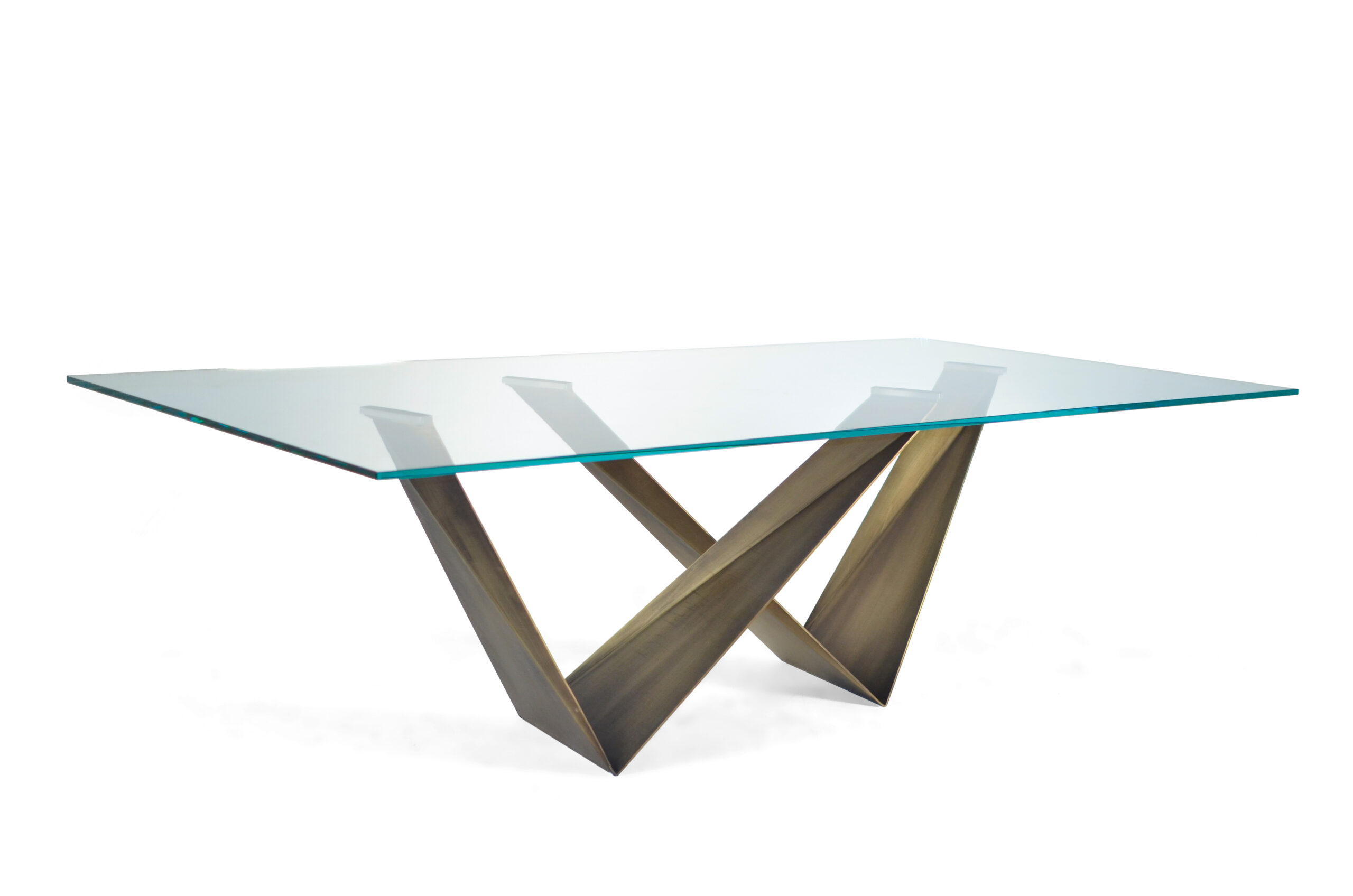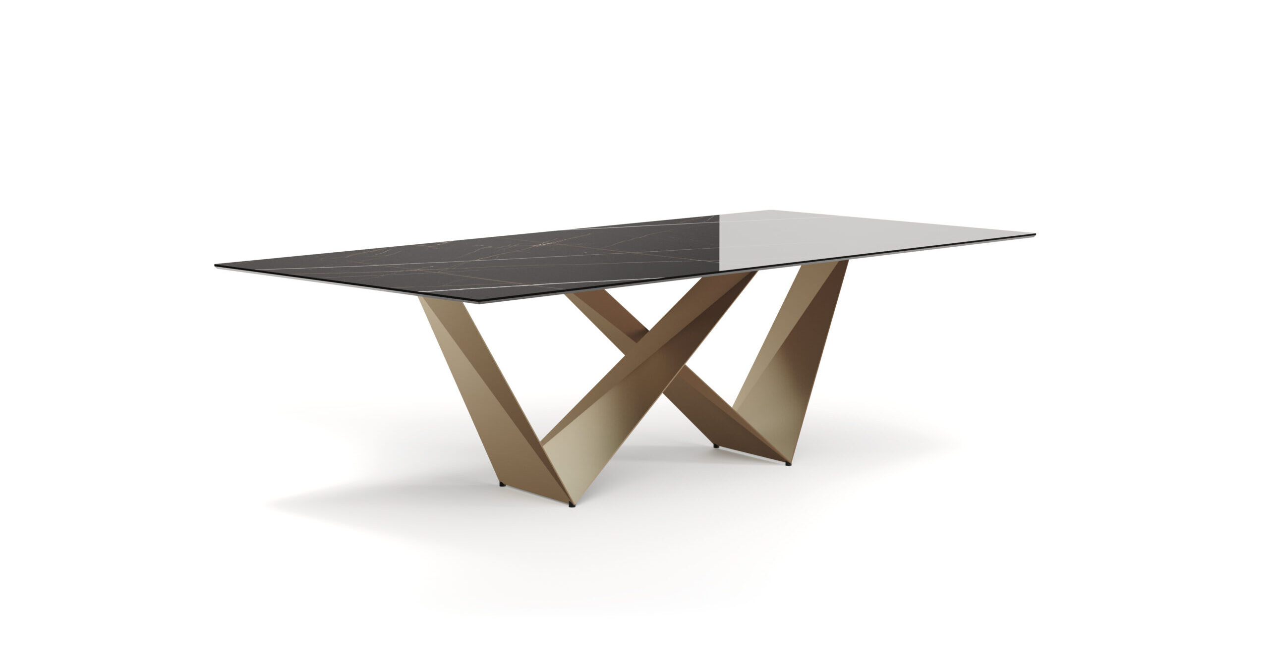 Tavolo da pranzo con struttura a due basi in metallo. Il progetto si basa sulla ripetizione modulare delle basi, mentre la personalizzazione è concentrata sulle finiture e sulle tipologie di piano.