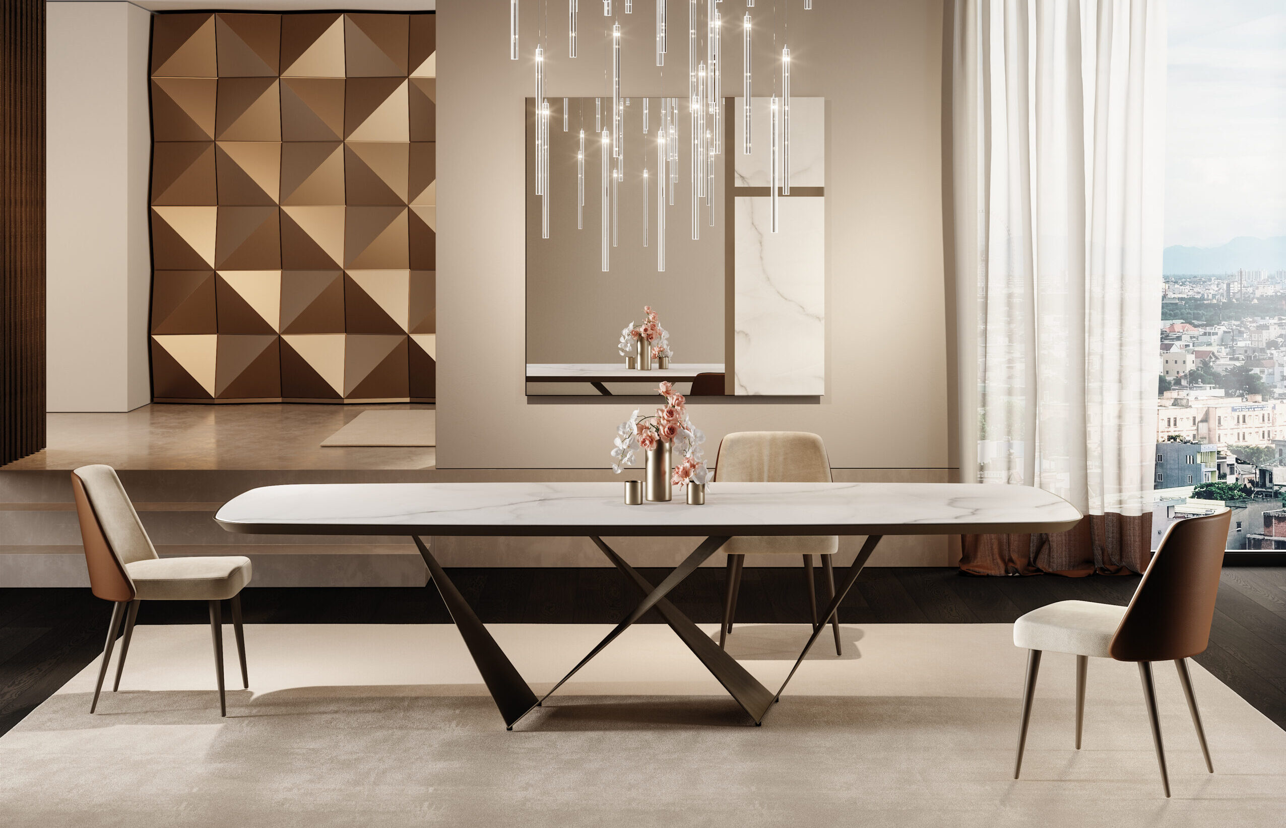 Prisma 72 steel - Ludwig sedia - Comete lampadario - Origami composizione - Mondrian specchio