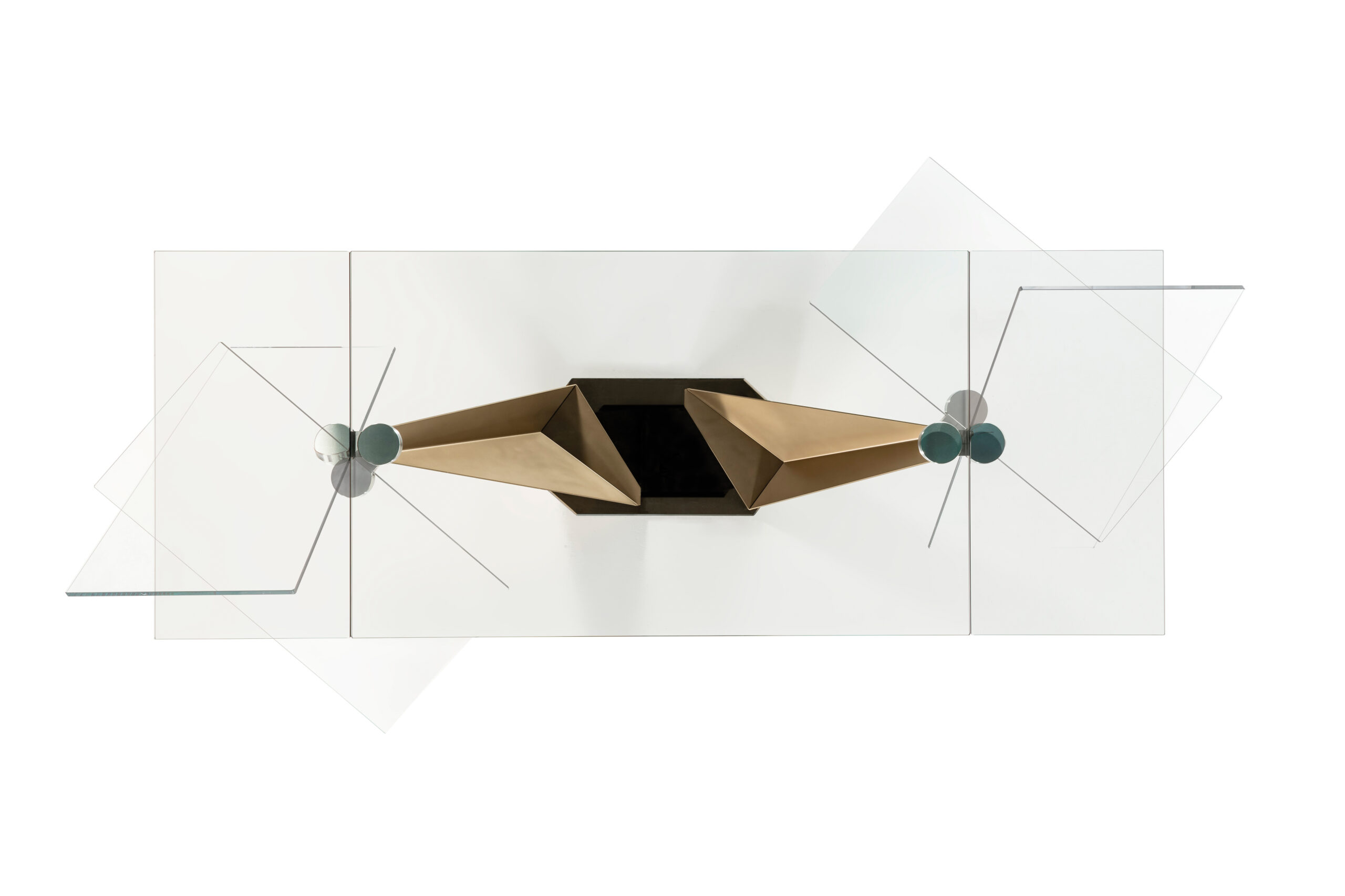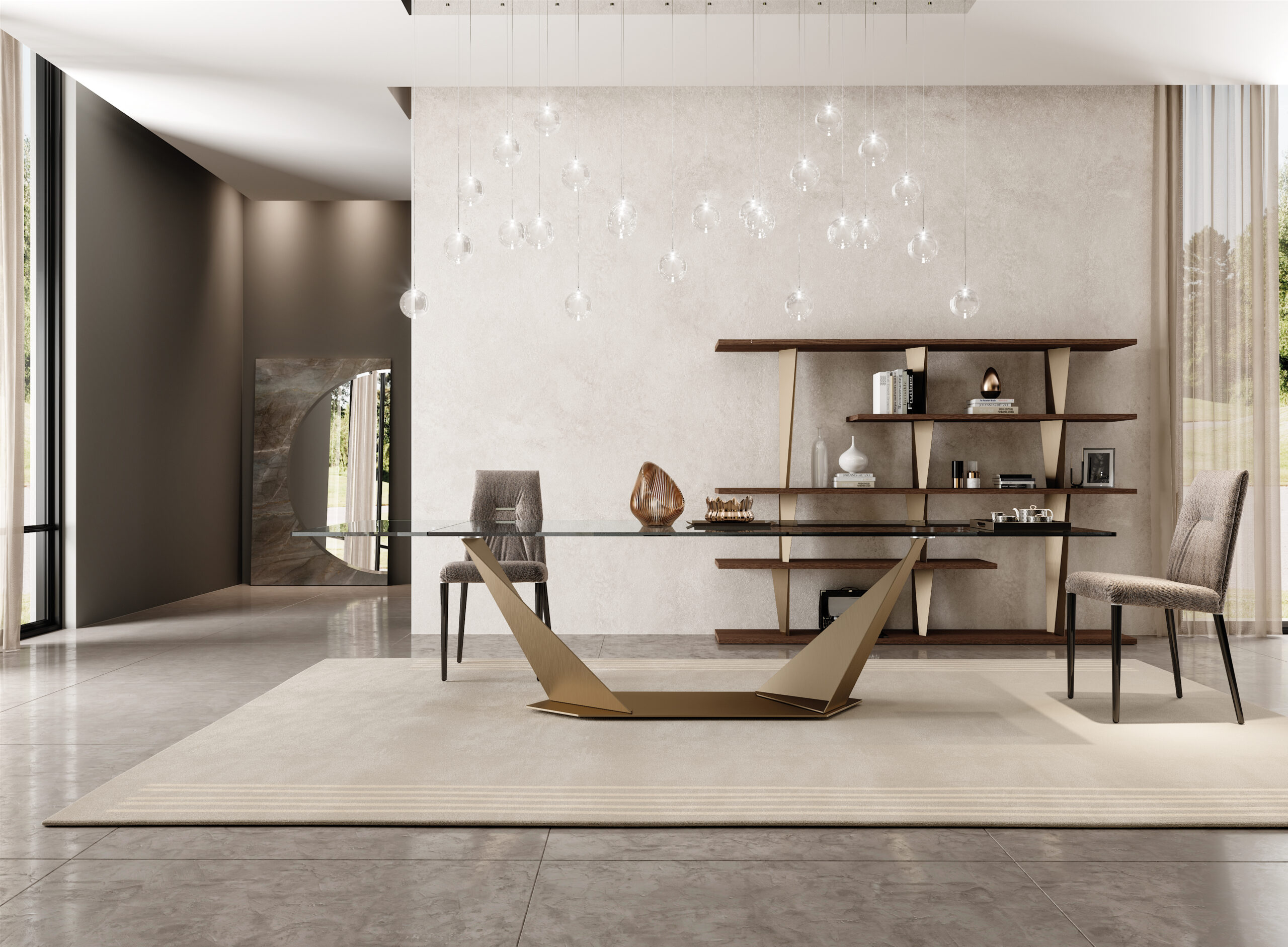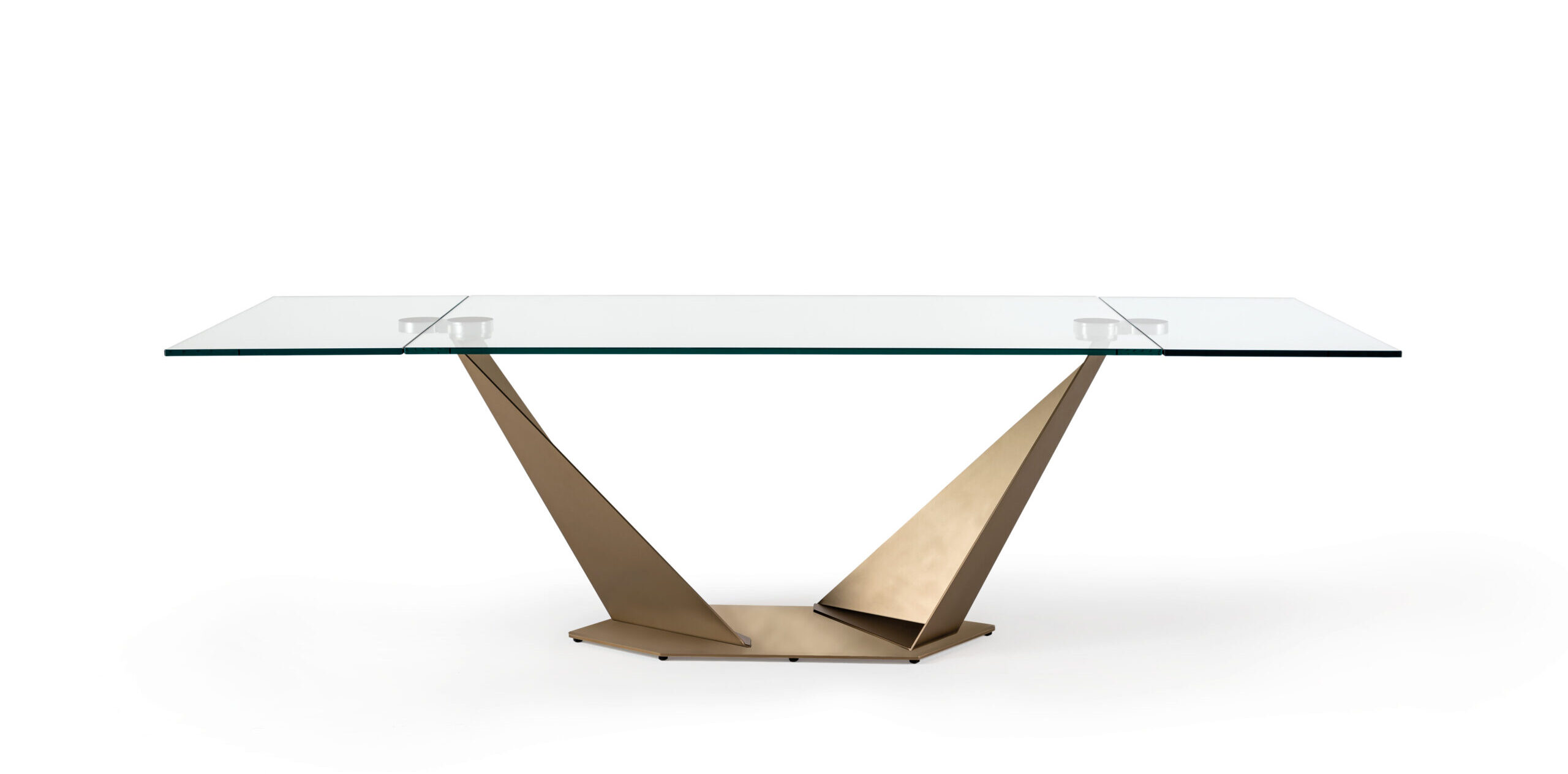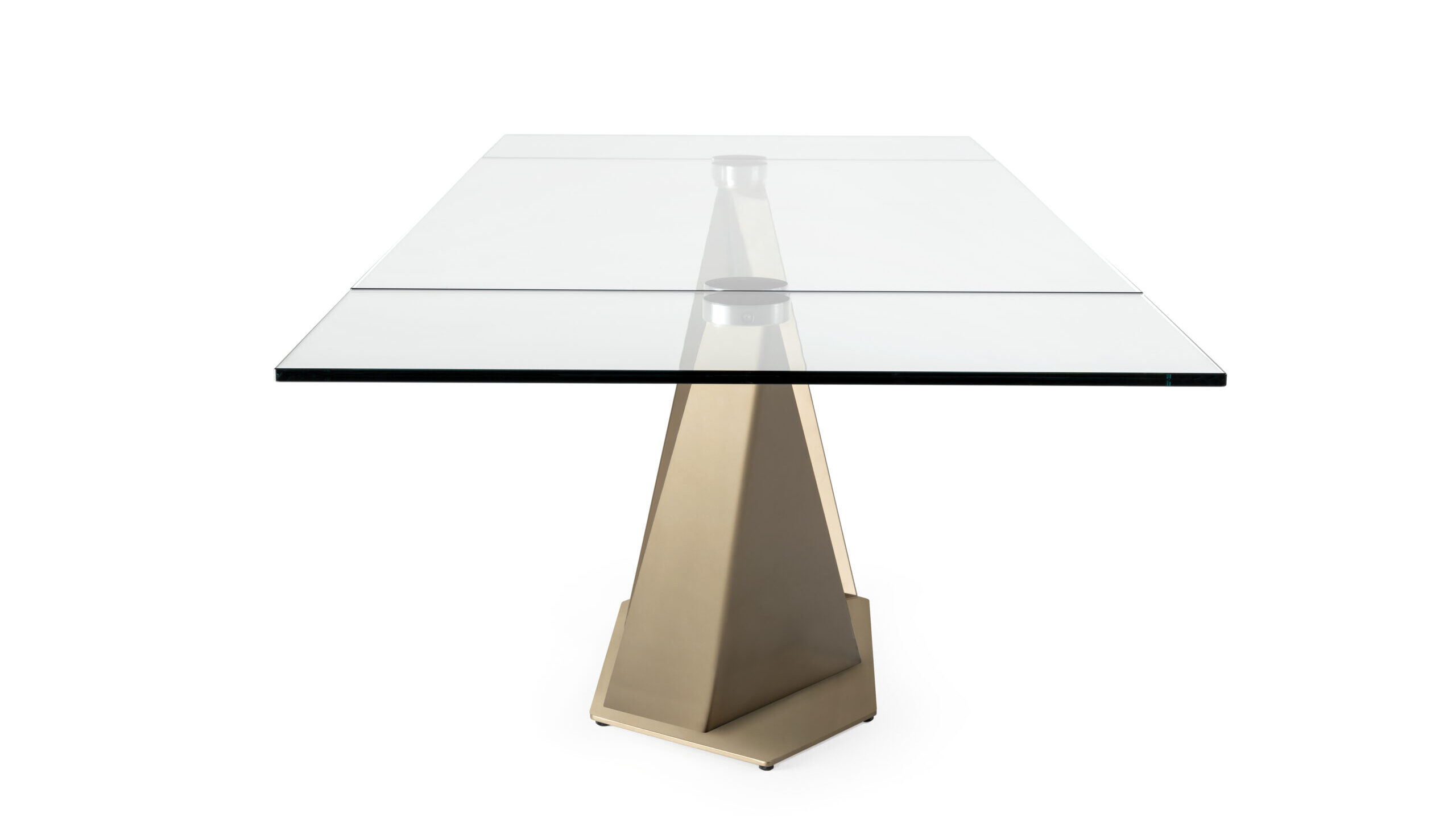 Tavolo da pranzo allungabile con base in metallo e piano disponibile in diverse configurazioni materiche.