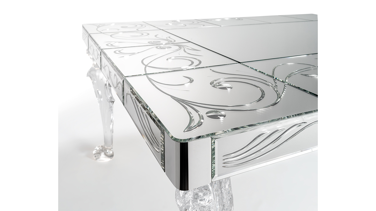Tavolo da pranzo scenografico con base in vetro di Murano illuminata e piano decorativo a forte valore artistico.