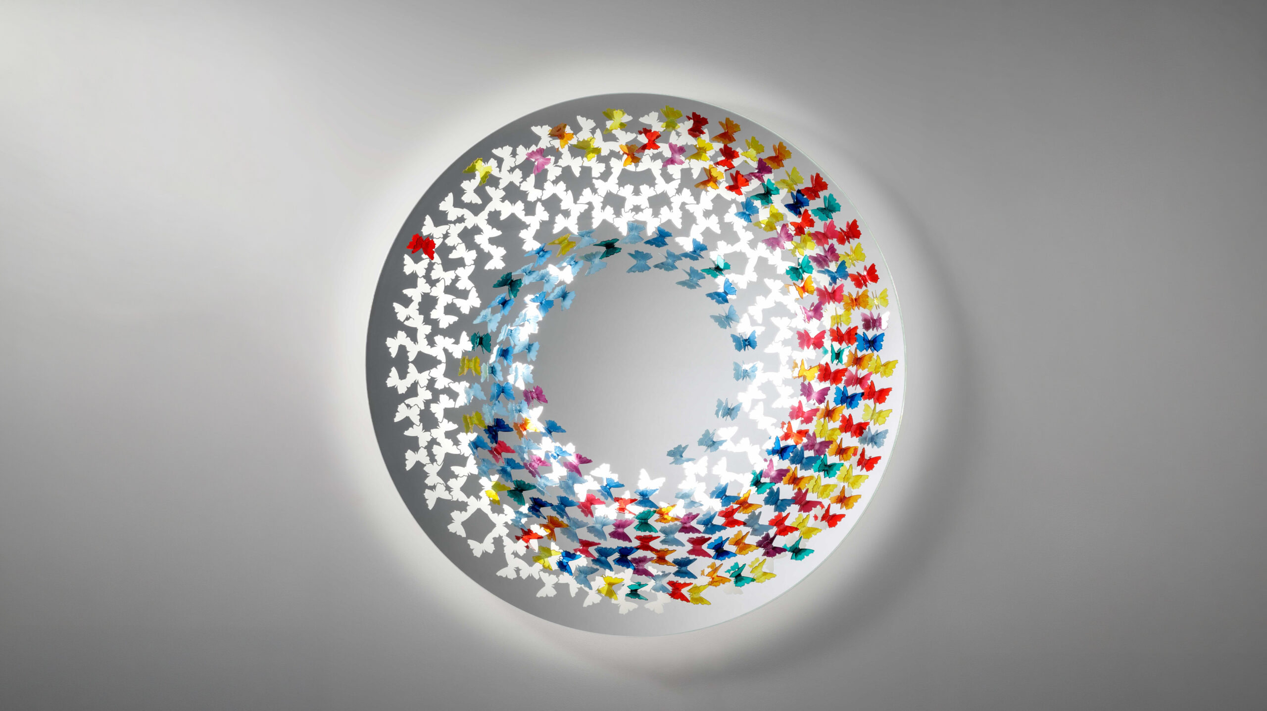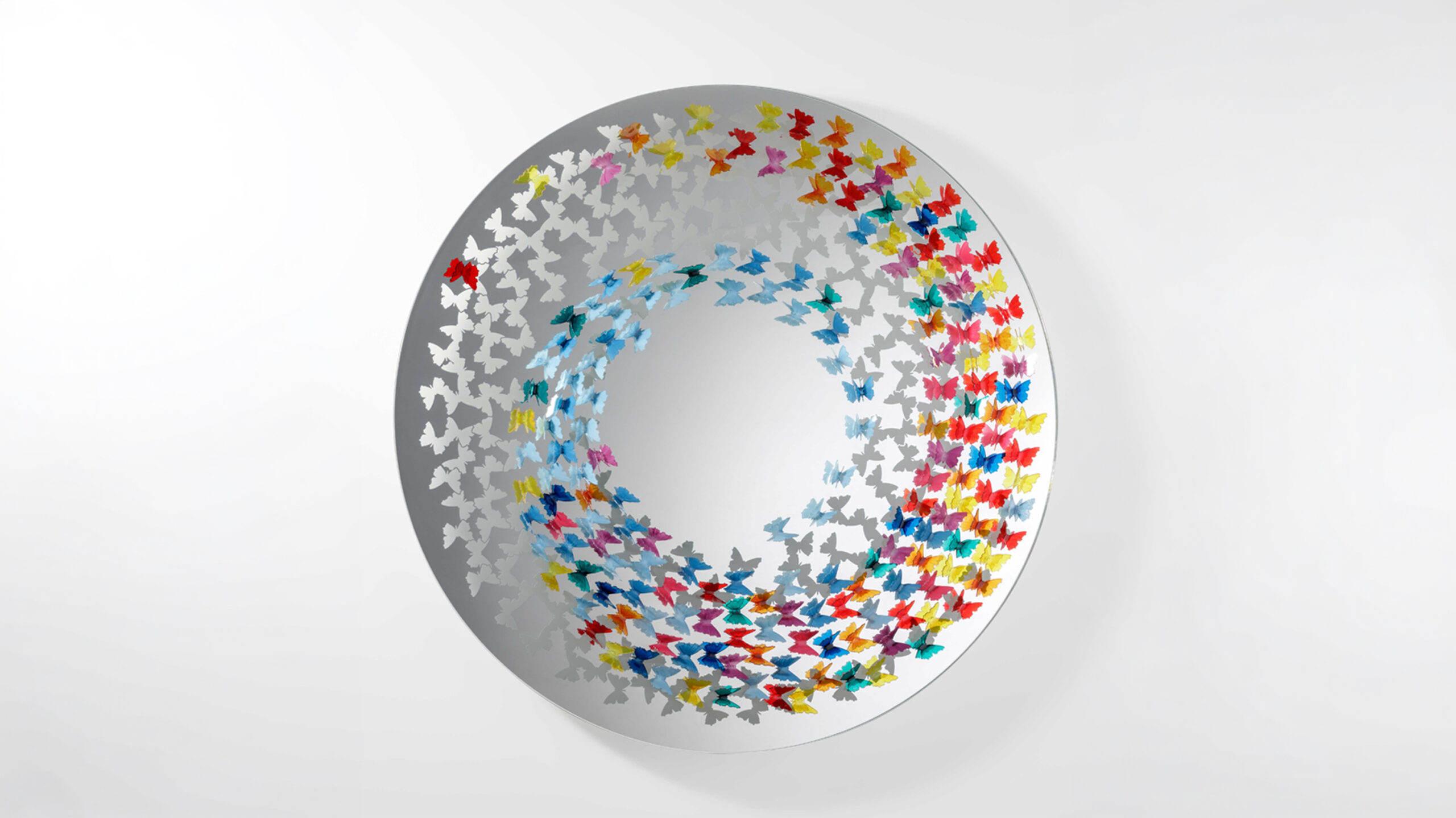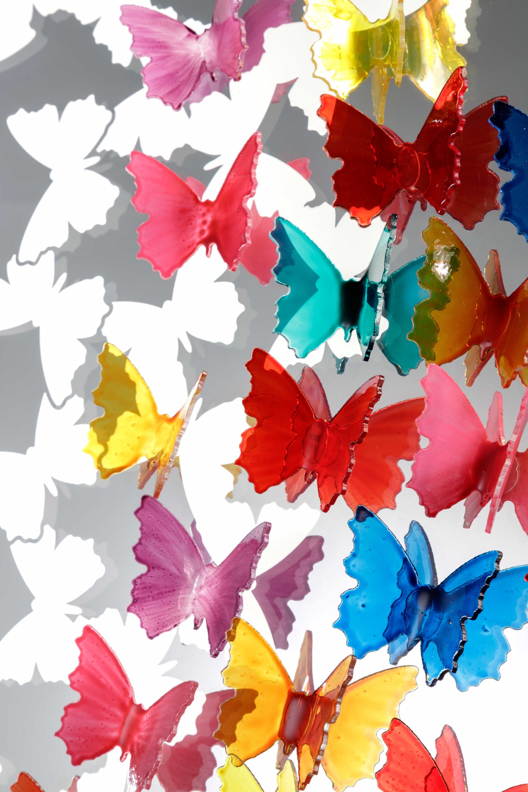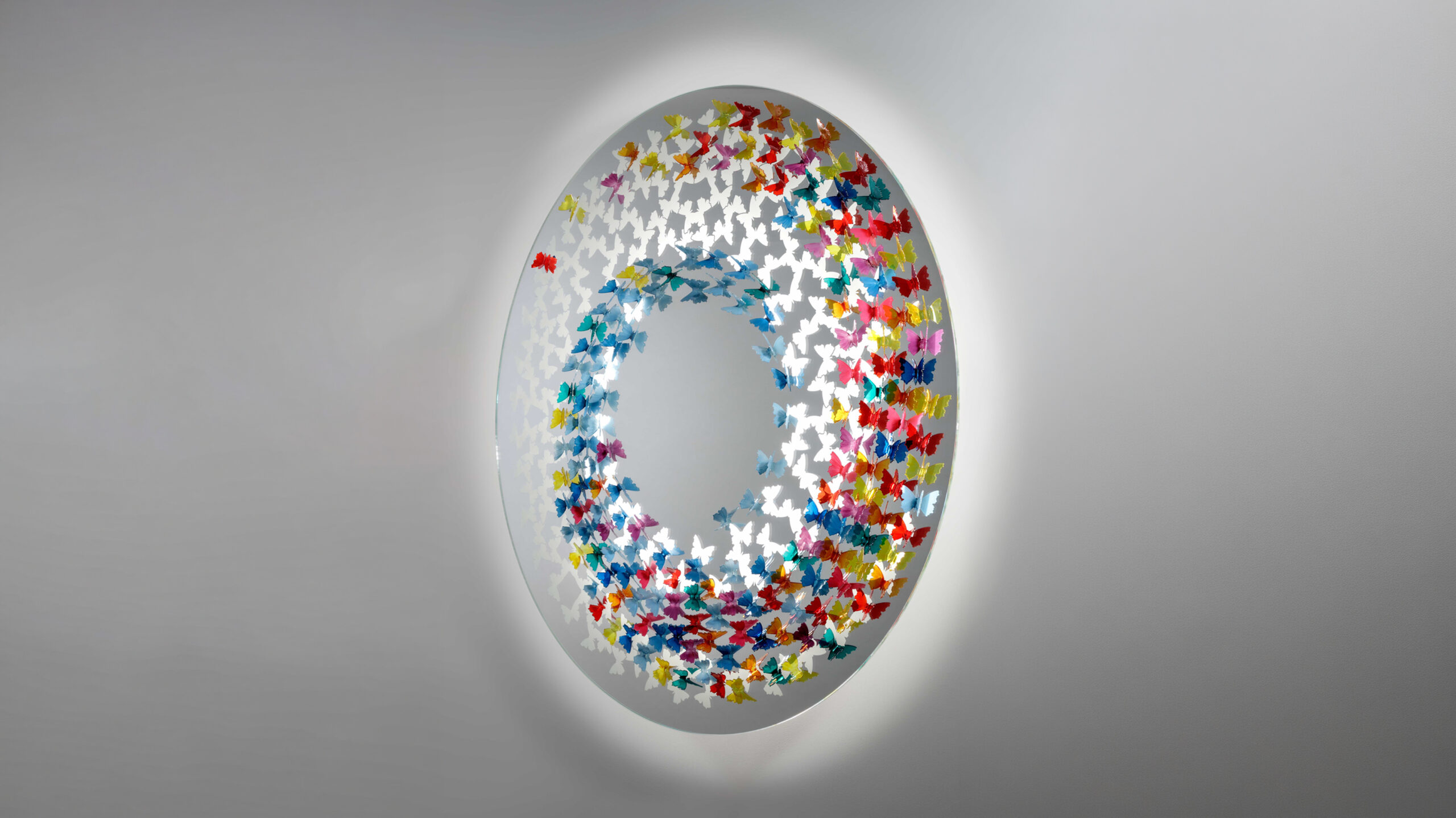 Specchio in vetro, con decoro di farfalle in vetro dipinto.